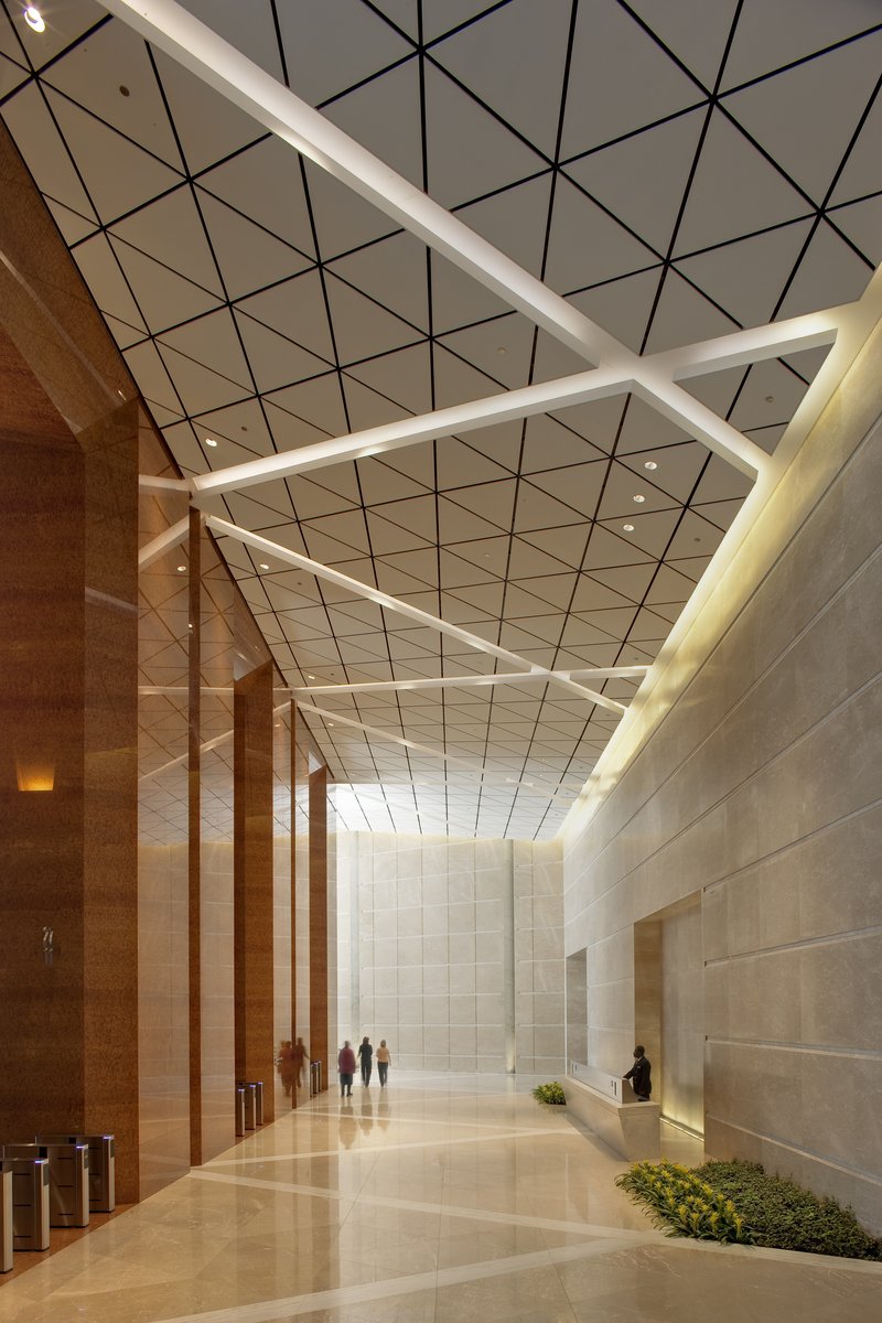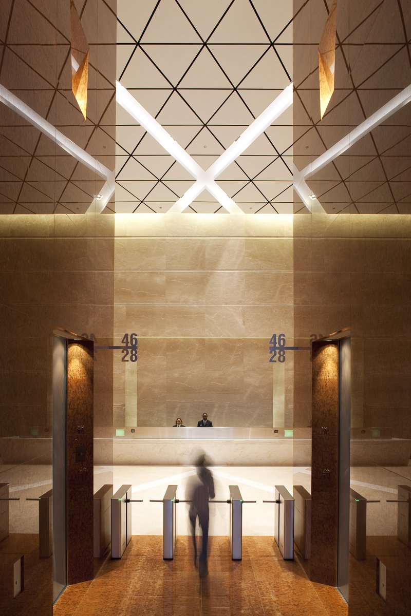 Emphasizing the building’s civic presence, a covered, 45-foot-tall arcade runs the length of the building’s southern façade and fronts a two-story lobby, clad in a cable-supported wall of oversized glass panels. This expression defines a minimal, highly transparent enclosure that blurs the distinction between inside and out. Combined with an adjacent pocket park, designed and developed by the same team, the arcade creates a welcoming public amenity.