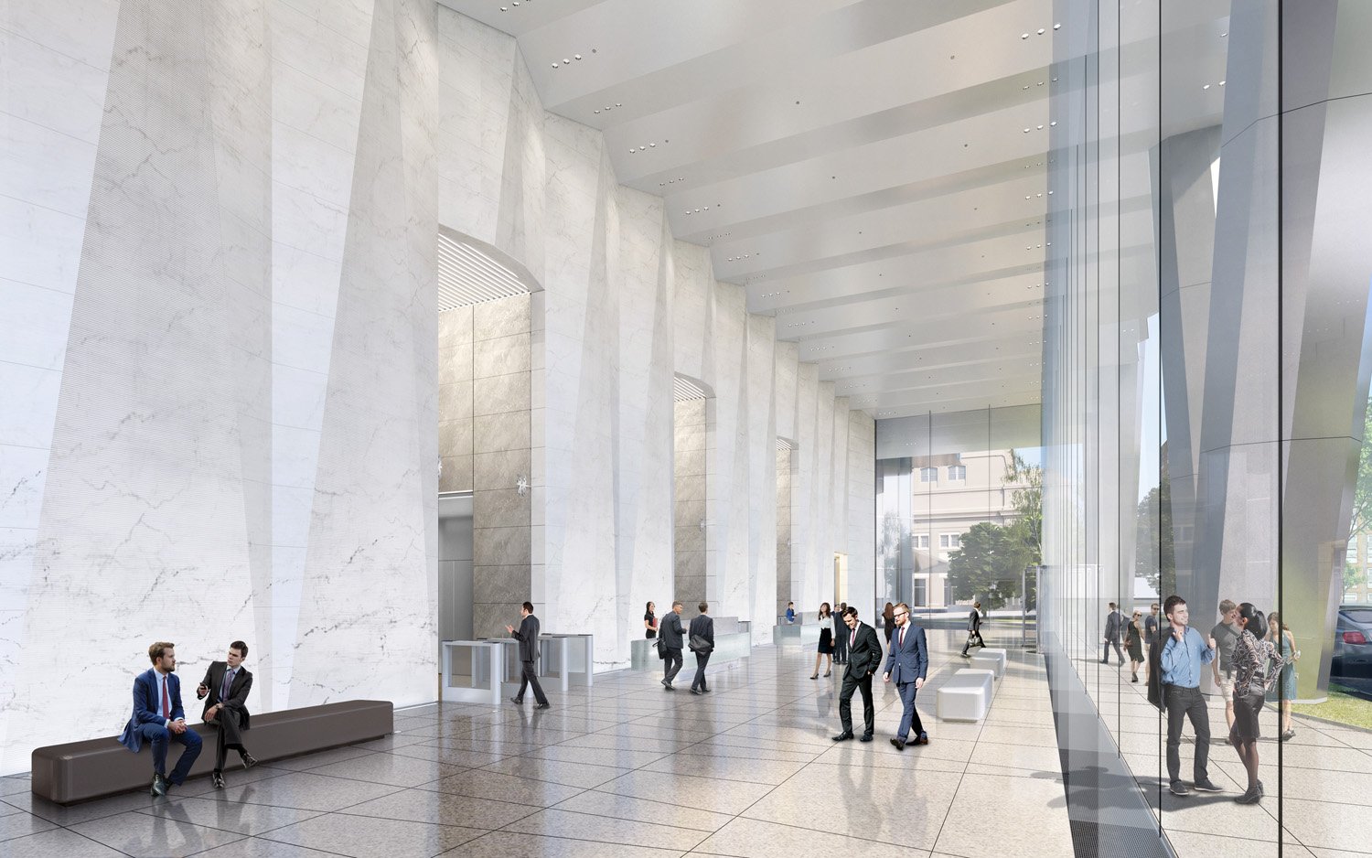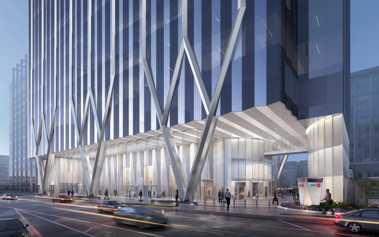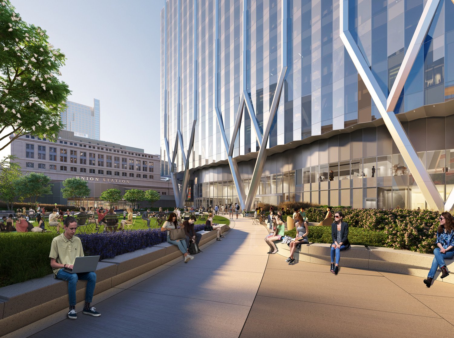 Designed as a stepped, three-tiered building, the 50-story tower is oriented in the north-south direction along the east side of the site. The east face of the building aligns with the property line, reinforcing the urban street wall defined by the historic headhouse on the adjacent block. The three setbacks reflect the internal organization of the building, with efficient, column-free floor plates that cater to a variety of tenants. Large terraces at each setback offer outdoor amenity spaces with expansive views of downtown. The building’s subtly folded façade creates an ever-changing texture that reinforces the verticality of the building. At street level, east and west façades express V-shaped structural transfers, which open up the ground floor. In this way, the park becomes an integral part of the building, and the building serves as an extension of the park.