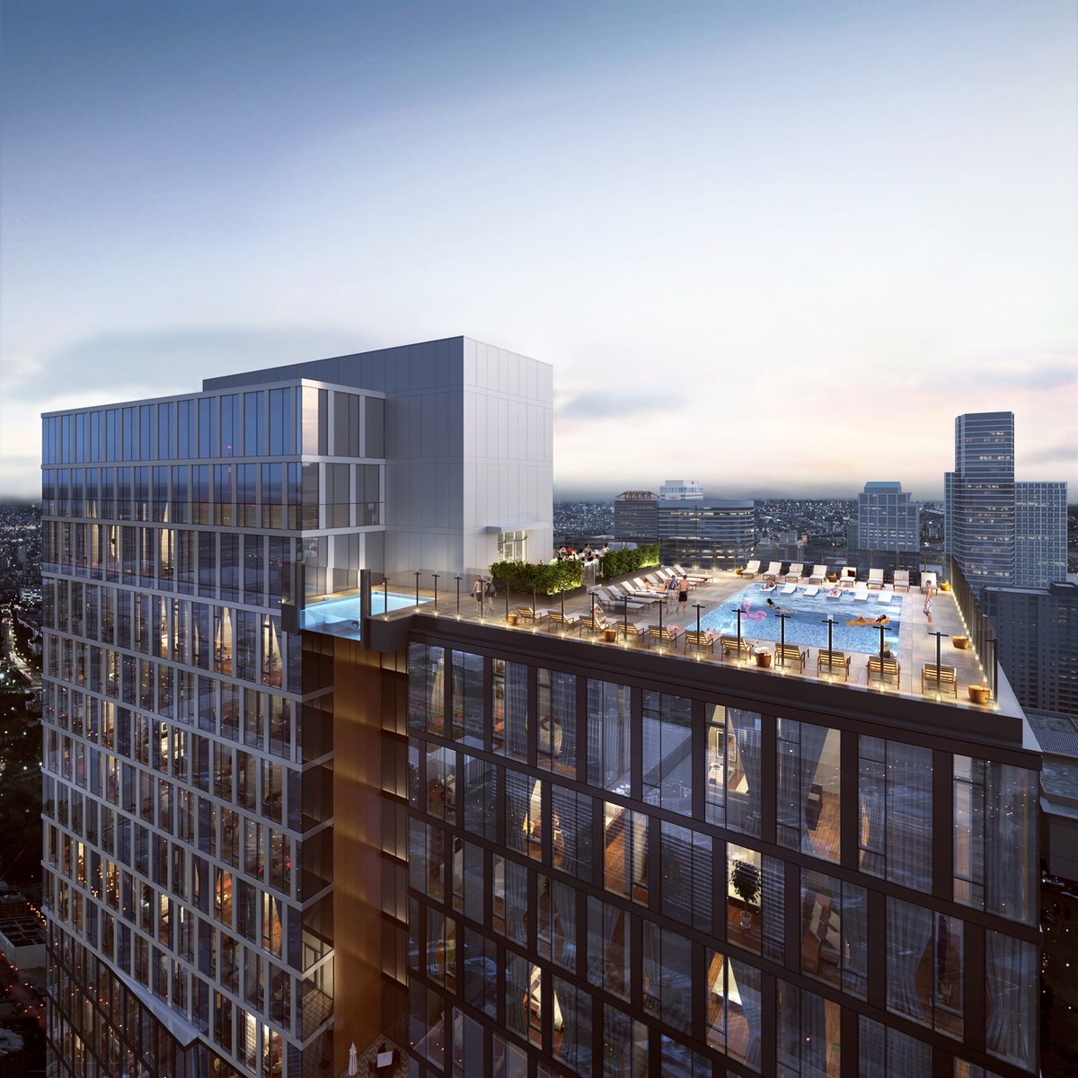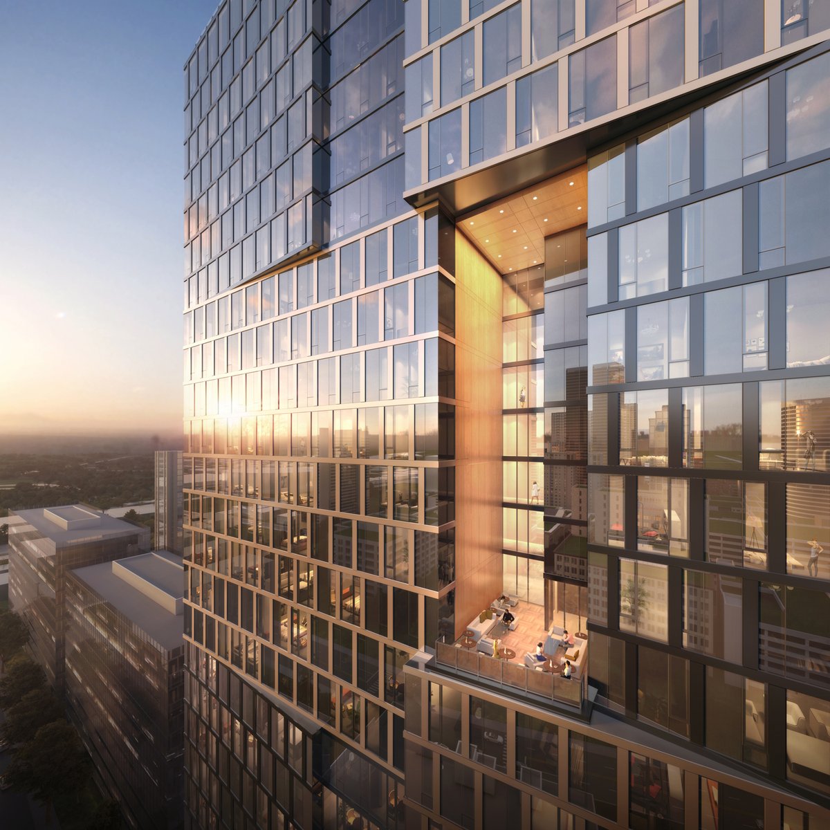 As part of the overall program, signature amenity spaces are creatively placed within four wood-finished aluminum cutouts, or alcoves, that feature intimate, communal outdoor terraces. Two of the 75-foot-tall terraces will face east toward the Nashville skyline, and two others will face west, with unobstructed sunset views. Rooftop amenities include a business center, private dining with a catering kitchen, a game room, lounge, and an outdoor pool deck, featuring a lap pool with a six-inch-deep sun shelf and a separate glass-bottom pool that overhangs the 27th floor amenity terrace on the west side of the building.