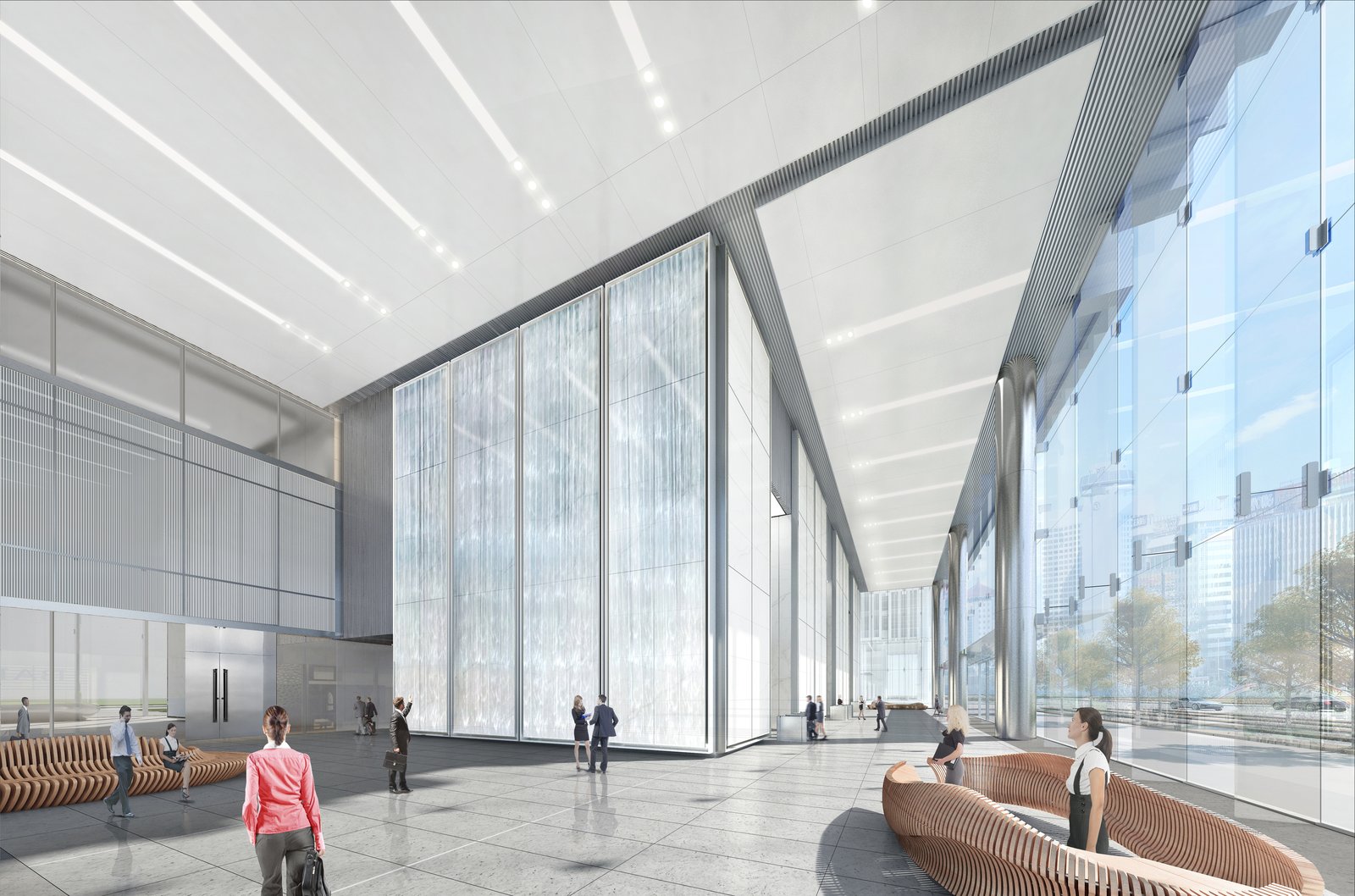 The upper zone of the east tower is reserved expressly for Grandjoy headquarters, while the upper zone of the west tower will accommodate multiple tenants. The interior is designed to allow for flexibility and provide ample social space to promote employee interaction and an open exchange of ideas. A large internal atrium connects the social zones on each floor, creating a continuous open space from the main lobby up to the sky terrace. At the top of each tower, the large, 300-square-meter sky terrace offers a spectacular outdoor amenity space.