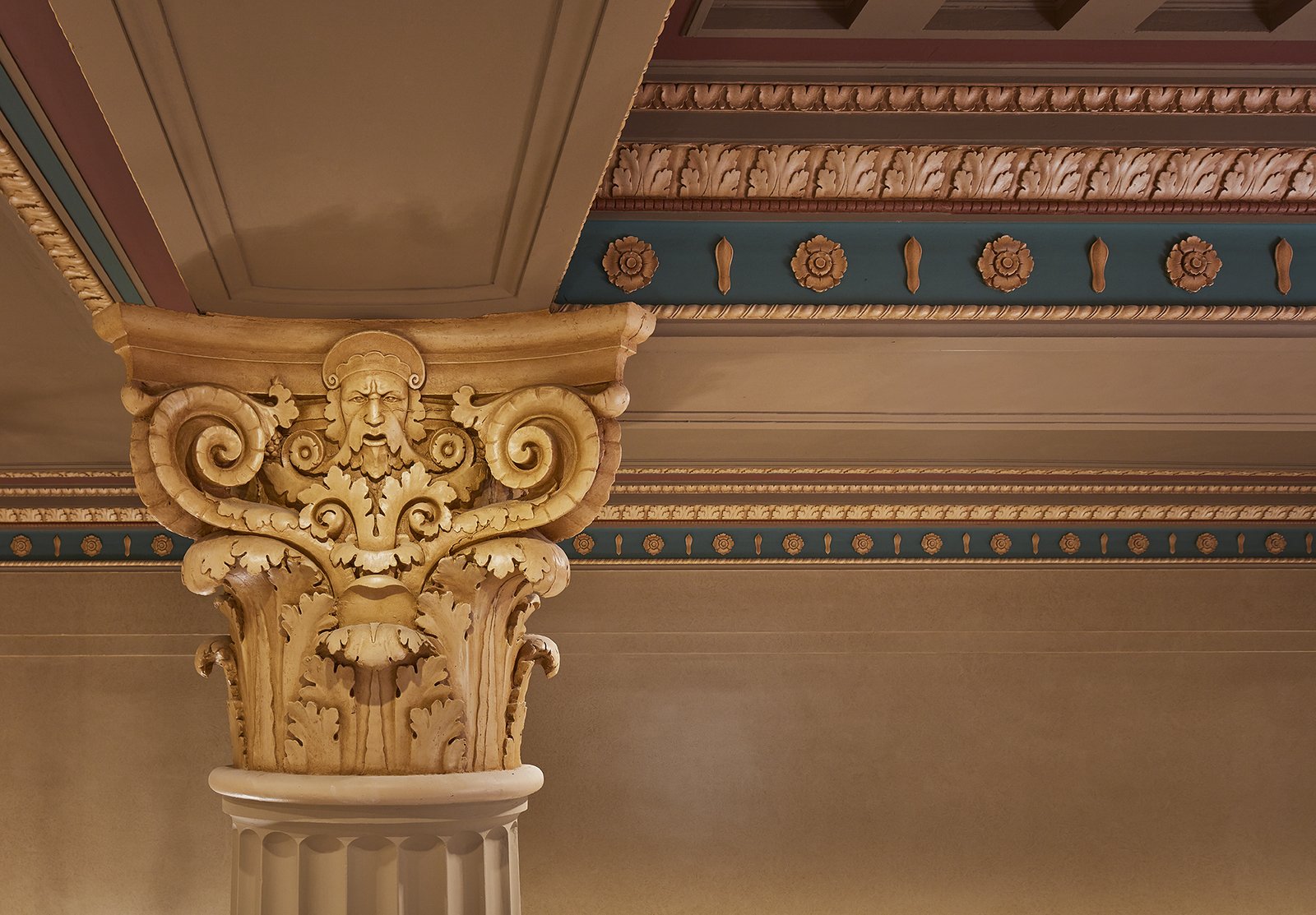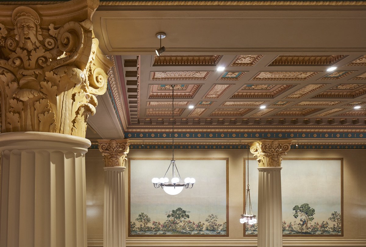 Seven historic bronze light fixtures were returned to the space, with five fixtures found in pieces in storage and two others found and relocated from another room. All seven were polished, cleaned, recast and rewired. These fixtures, along with two new complementary ceiling pendants and period-appropriate floor torchiers, have been outfitted with remotely controlled LED lamps, allowing for color variations that facilitate a variety of unique atmospheres for events.