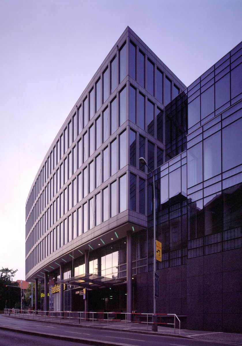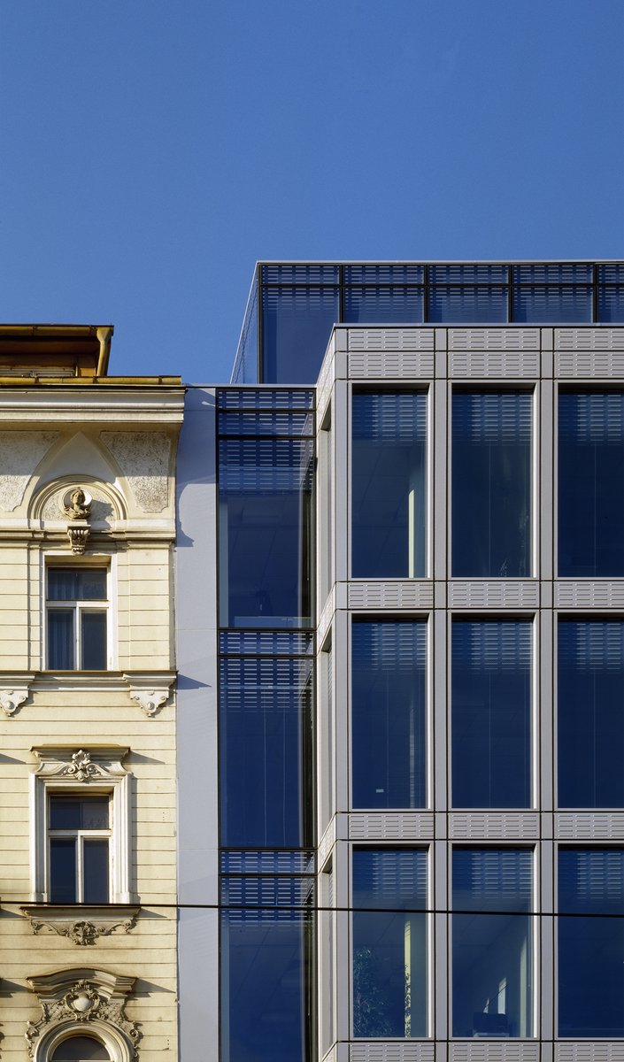 Prague is a city that is uniquely conscious of its history, and the opportunity to construct a new building there is rare, as the demolition of existing buildings is seldom permitted. The site for this building was bombed during WWII and had not been built upon since. The primary challenge was to design a contemporary office building that fulfilled today’s business requirements for flexibility and technology, while respecting Prague’s historic architectural context. The massing of the building recognizes the street wall and cornice lines of adjacent buildings. Fritted glass and embossed aluminum curtain wall panels provide the facade with a sense of scale and detail that complements the architectural traditions of Prague.