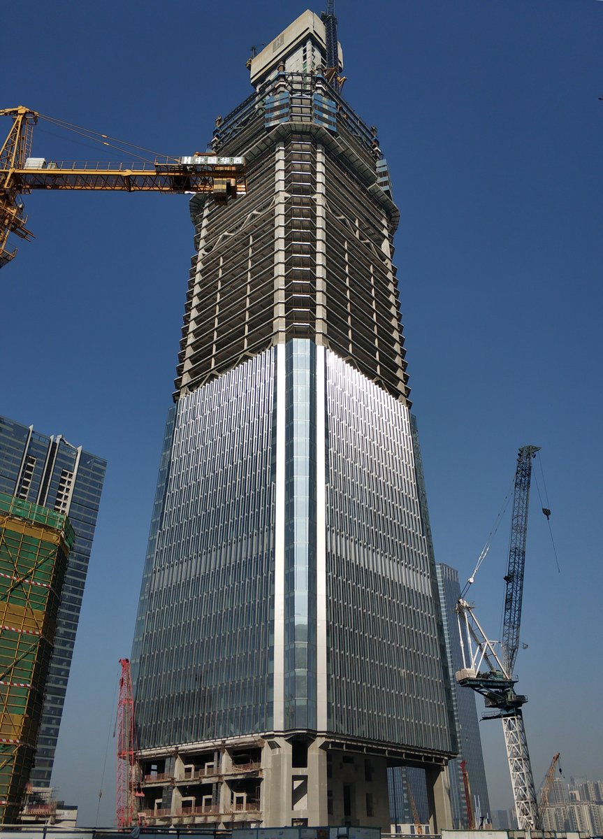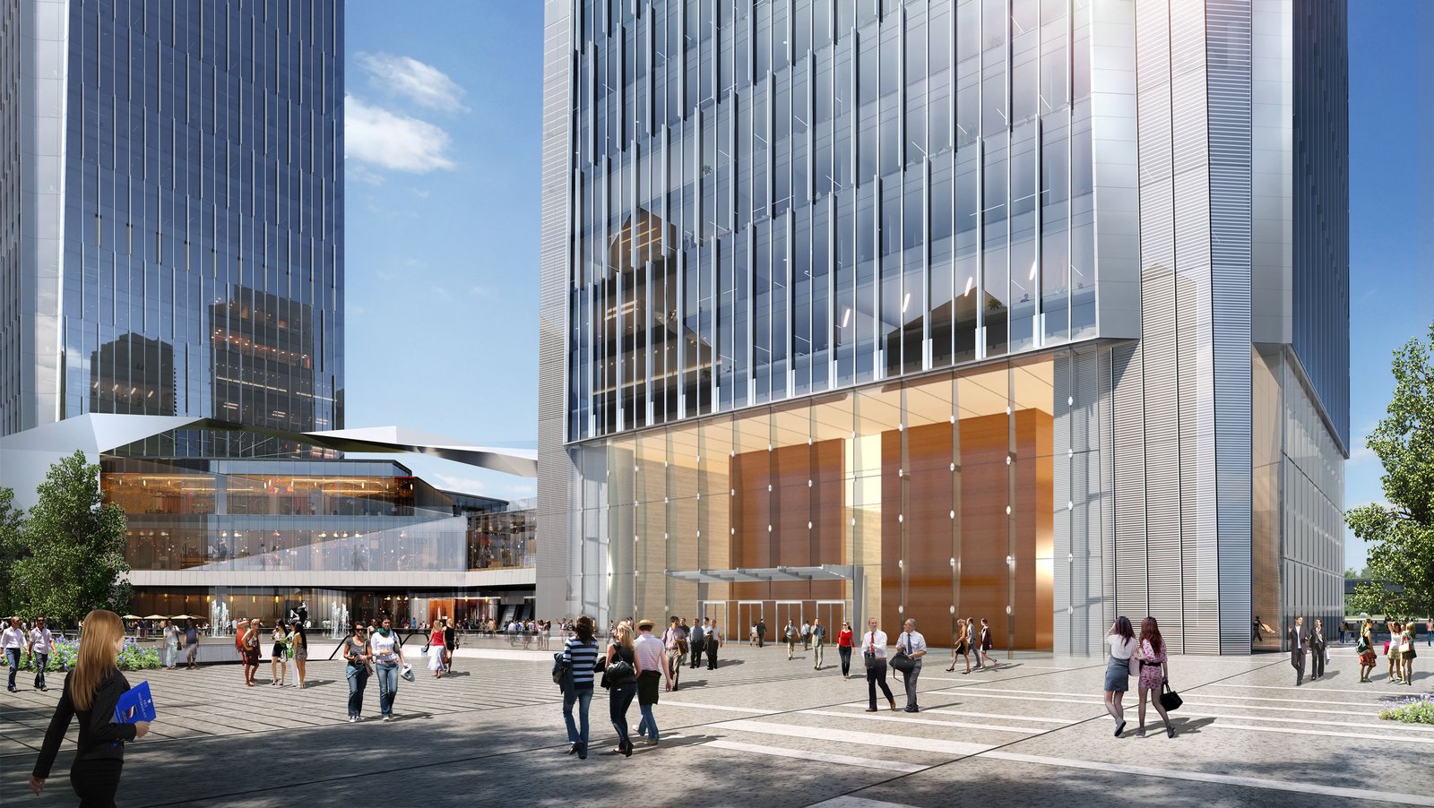 The landmark for the development, a 62-story, 293-meter office tower, is designed as a simple, elegant structure anchored by four pairs of mega-columns marking the building’s chamfered corners. As the building rises, the corners slope inward, with the tower culminating in a low-slung V shape to define the building top. A textured façade on the tower’s four sides contrasts with the smooth, reflective corner facades, providing a distinguished presence in the skyline.