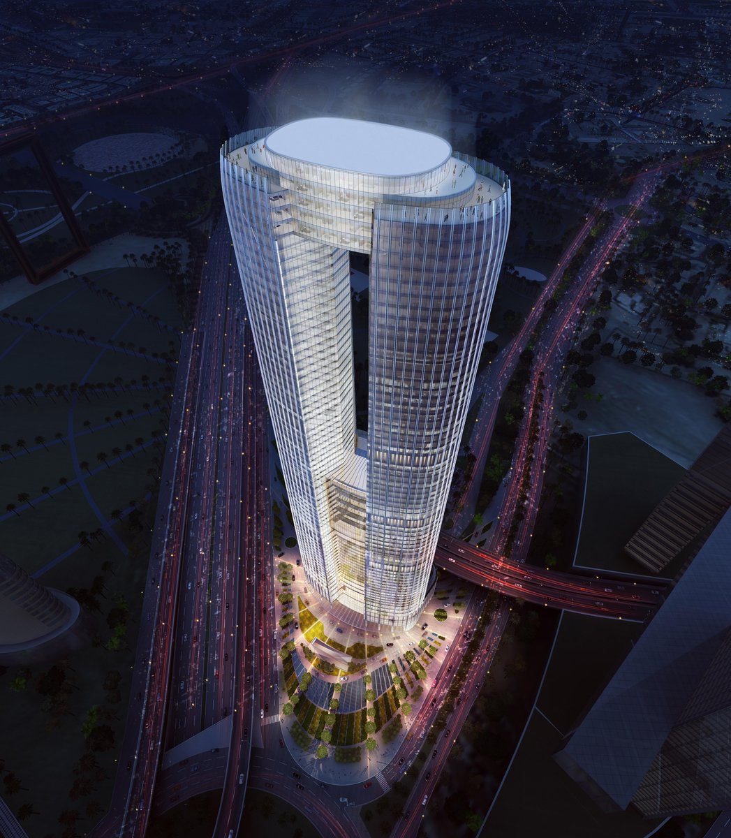 Rising to a total height of 305 meters, the tower is defined by an oval footprint that unites two slender, independent volumes with a large void on the upper levels. A series of atria with bridges and balconies fill the void in the lower and upper portion of the tower, creating an “urban window” that allows for views both of and from the building. In addition, this “window” frames dramatic views of the sunrise and sunset through the building along the east-west axis.
