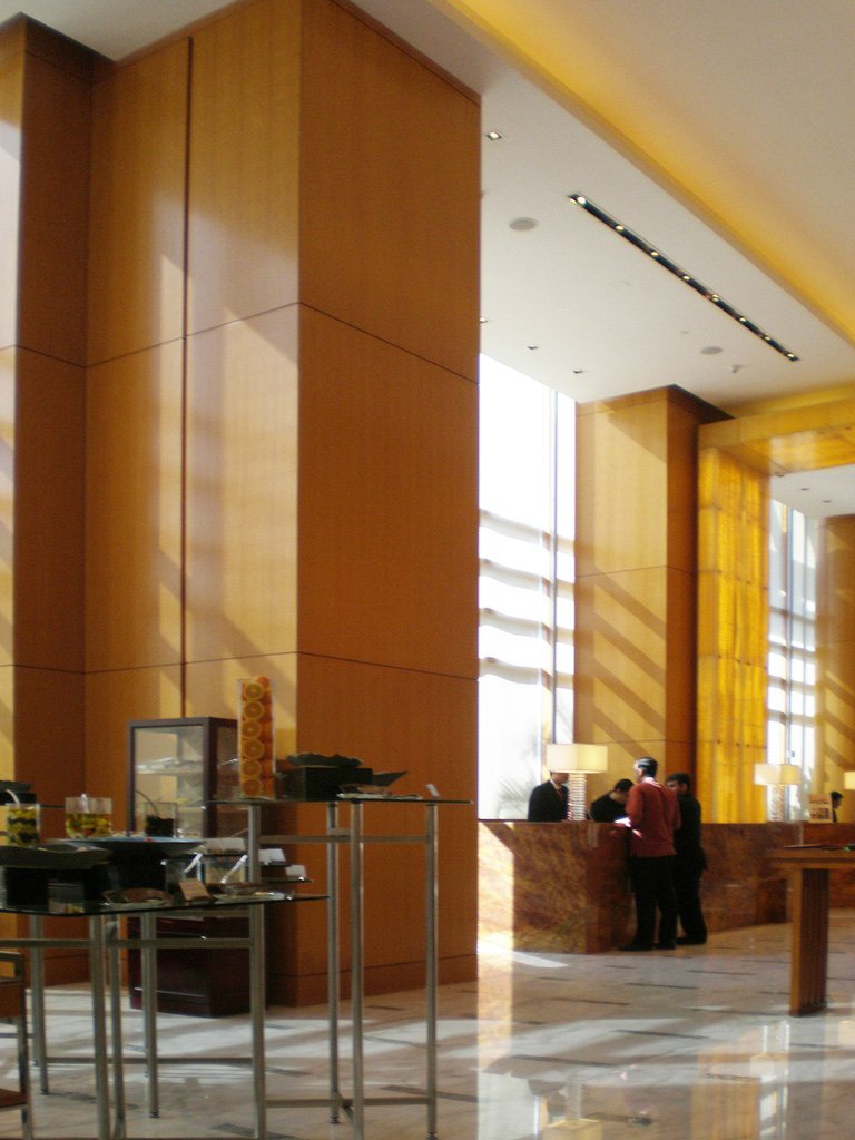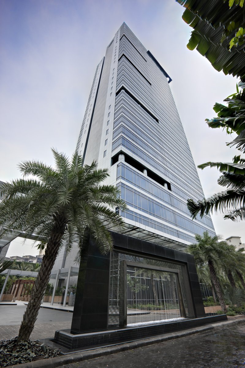 In keeping with Vastu, the building is properly oriented to the sun, and its highest point, a spire that serves as the hotel’s antenna, is positioned at the southwest corner. Refuge floors mandated by the building code are placed at intervals on the front and back elevations. These refuge floors appear as balconies on the facade, providing visual contrast to the smooth curtain wall of non-reflective glass. An attached, three-story building with a floor-to-ceiling glass facade contains a restaurant and rooftop pool.