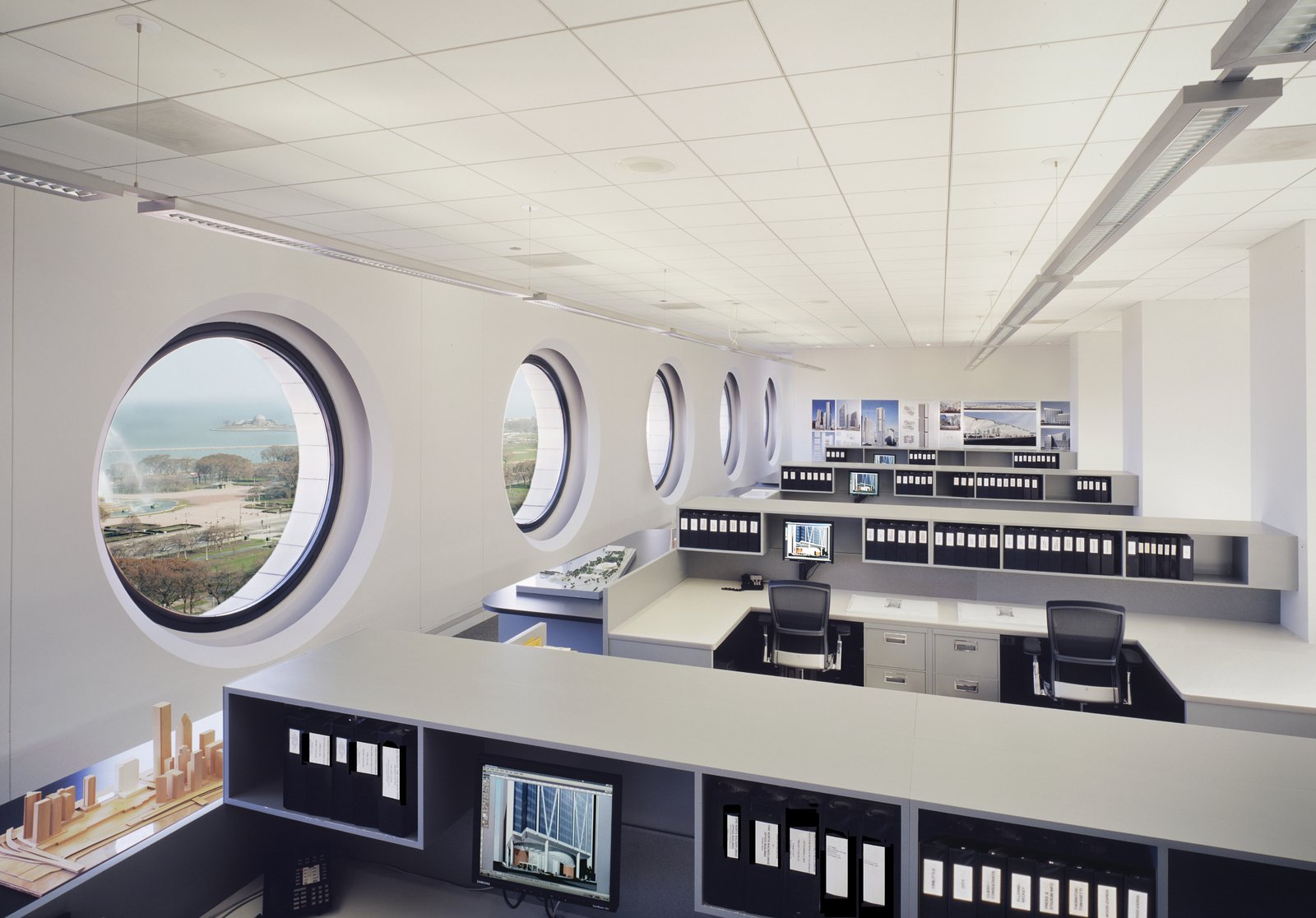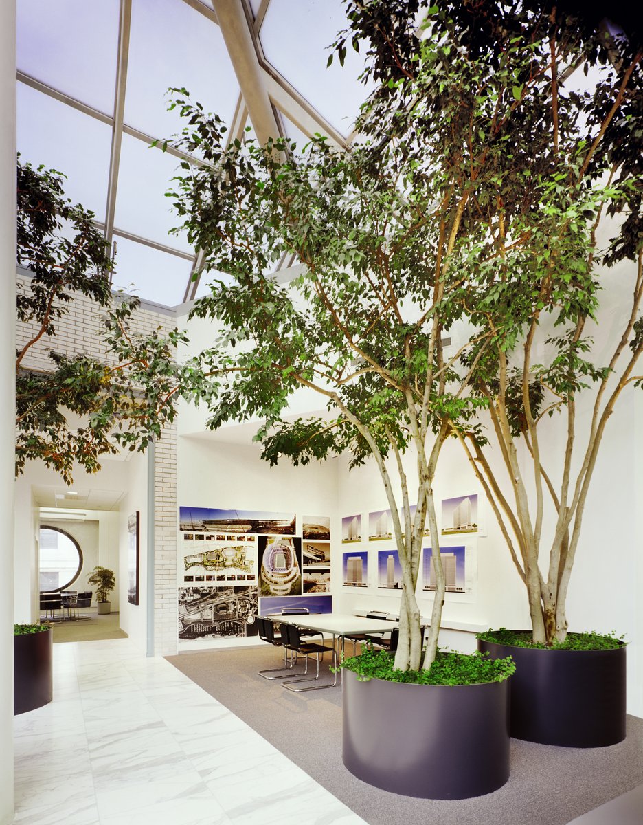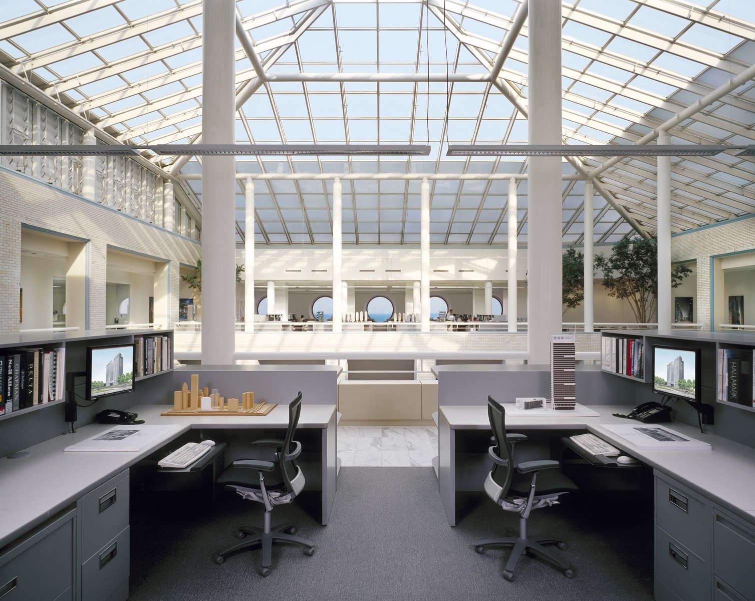 The overall office plan emphasizes clear organization, unity and openness, providing a work environment that is both inspirational and productive. The simple, clean environment becomes a backdrop for the firm’s main activity: design work for its clients, which is prominently displayed in models and drawings throughout the office.