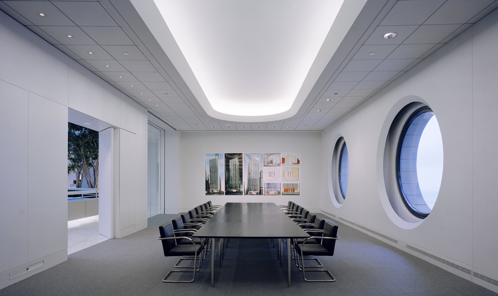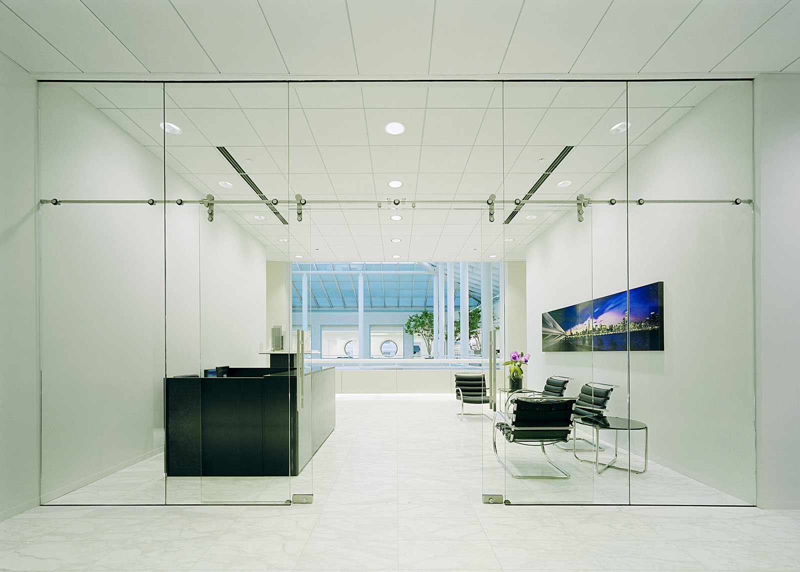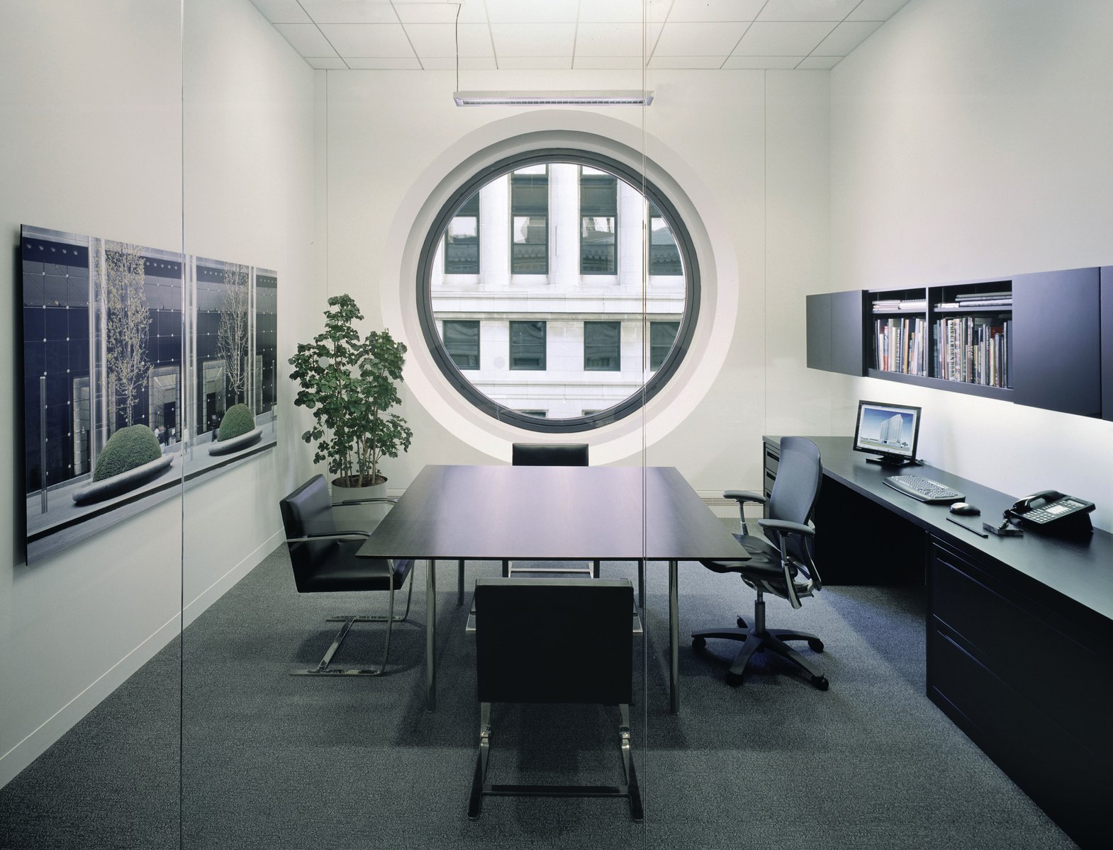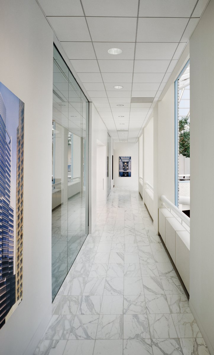 The office entry sets the tone for the design and introduces the firm’s modern aesthetic with a full-glass enclosure and ultra-clear doors that slide on a stainless steel support. White Carrara marble flows through the lobby floor and surrounds the atrium, identifying the primary circulation and unifying the space. The open-plan studio is fitted with low, linear workstations that allow for clear views to the windows and skylight while providing enough privacy to be productive. Meeting rooms and executive offices reinforce the space’s modern, clean aesthetic, following the organization and rhythm of the large, circular windows and separated from circulation corridors by full-height glass partitions.