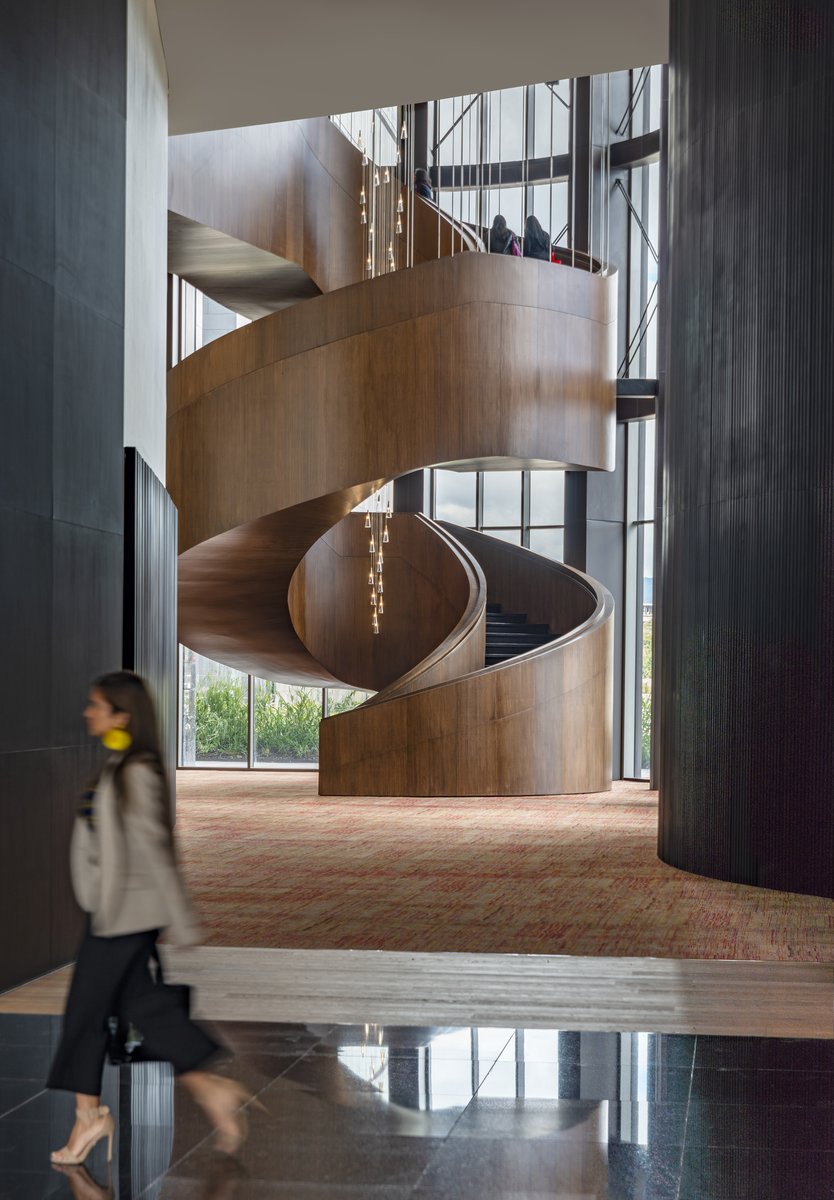 The hotel base is a three-story, hourglass-shaped podium that reflects the internal arrangement of the amenity programs. Forming a boundary between the internal paseo of the Ciudad Empresarial and the adjacent neighborhood, the podium is clad in warm stone, wood, metal and glass to reflect its surroundings. The main hotel lobby is located at the narrowest point of the podium, creating a transparent connecting link from the paseo to the adjoining neighborhood beyond. Outdoor dining and large gathering spaces are located along the paseo façade to create an active and inviting atmosphere for the hotel.