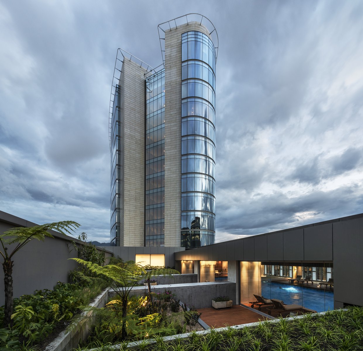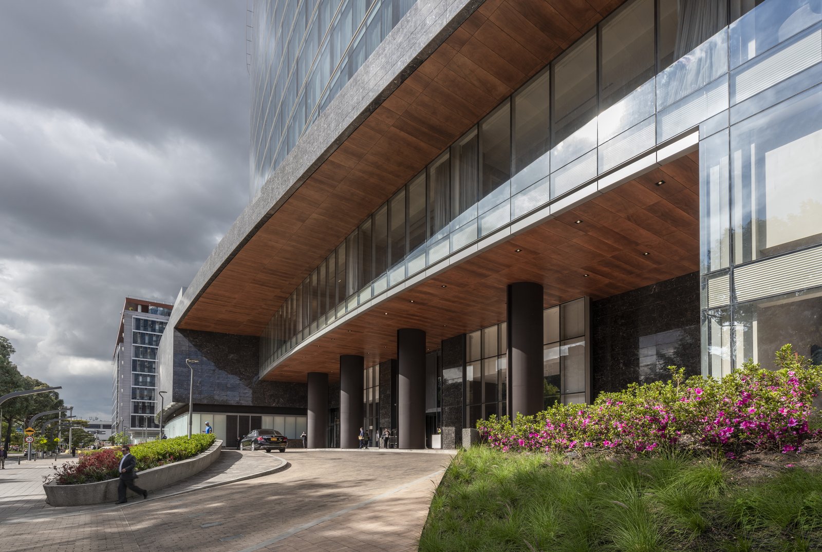 Rising from the podium base, the 70-meter-tall elliptical tower is designed to contrast with the rectilinear office towers of the surrounding complex. The curving façade creates a symbolic center to the complex while gesturing toward the city center and opening up views from the guestrooms to downtown. The taut, reflective glass façade symbolizes the arrival of the modern and progressive city of Bogotá. Capping the tower is an indoor-outdoor restaurant and bar that provide expansive views back to the city center as well as the surrounding mountainside.