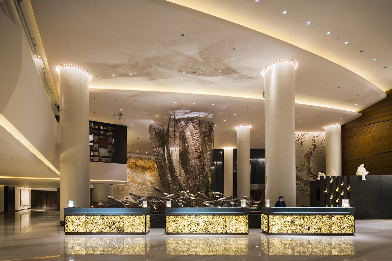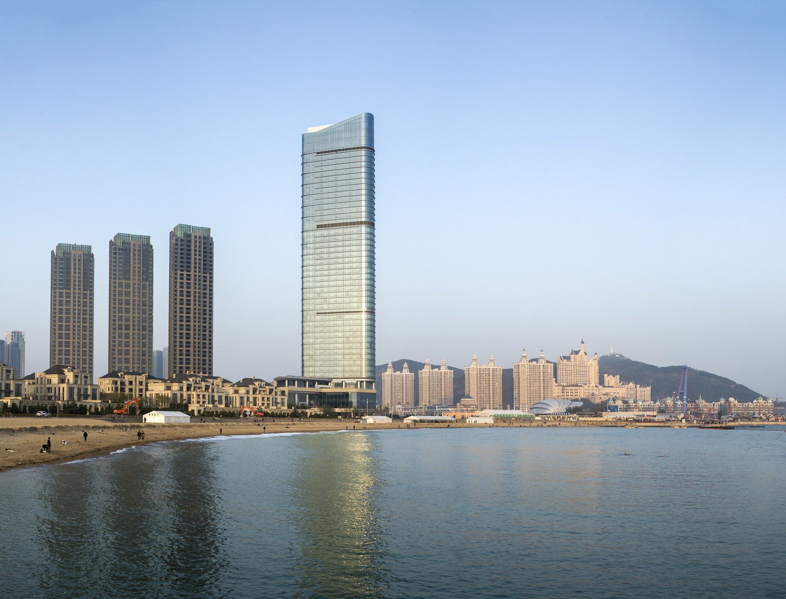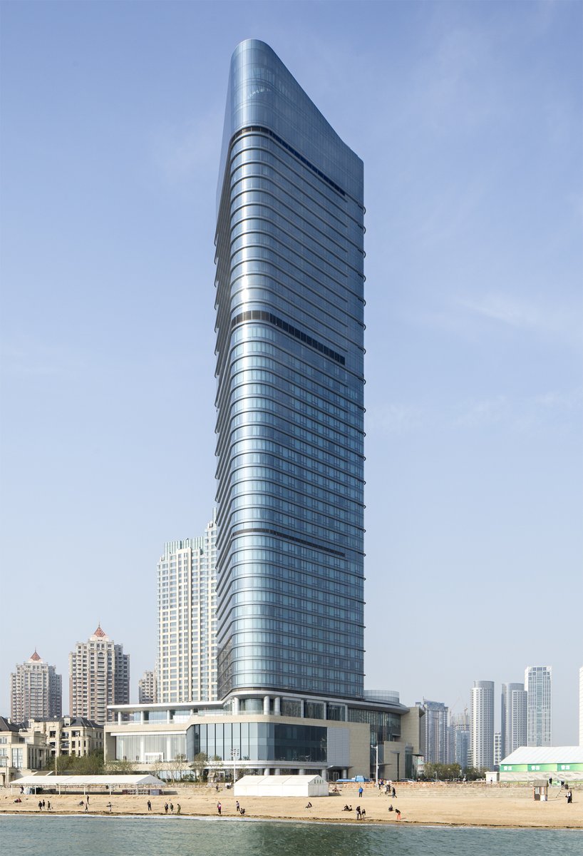 Located in China's northeastern coastal city of Dalian, this 370-key hotel and 84-unit serviced apartment tower sits unobstructed overlooking the Yellow Sea to the south and China’s largest public plaza, Xinghai Square, to the north. Reflecting its unique site, the building’s design responds to both its physical and environmental context. The tower’s triangular plan ensures that all rooms receive southern light as well as views of the sea and nearby mountain ranges. Additionally, the triangular form helps to mitigate the impact of the area's uniquely high winds, channeling them to the building's northern corners and minimizing the structural impact on the slender tower.