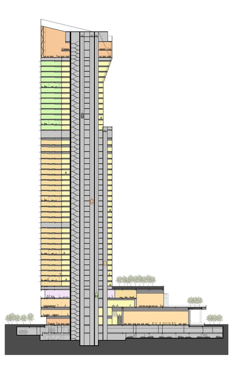 Programmatically, the hotel floors are stacked below the serviced apartment levels, enabling the core to telescope and creating the architectural "portal" along the north facade. Internal circulation is exposed on this face to provide all vestibules with ambient light and views of the park and skyline, while assuring a consistent lighting profile at night. The top two levels of the tower house the signature restaurant, offering unobstructed views in all directions.
