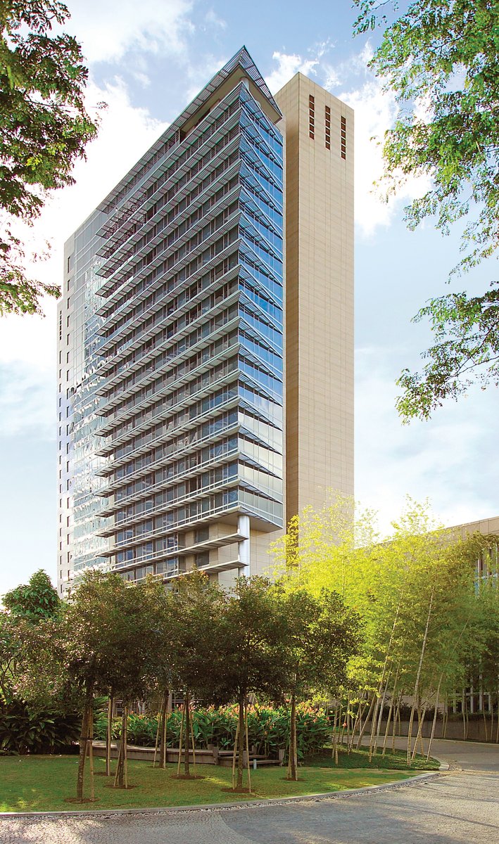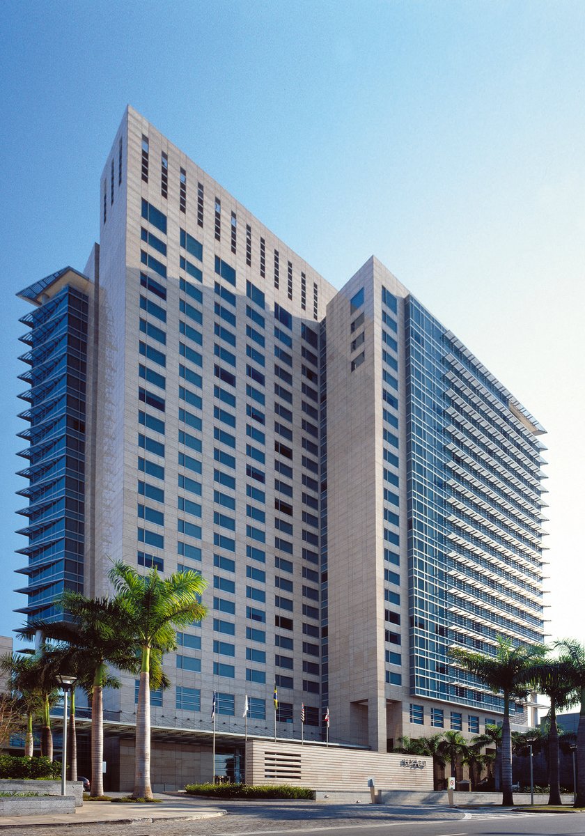 In its downtown location, the complex caters to international business travelers with three distinct elements: a hotel tower, a conference center and a separate dining facility that also serves residents of São Paulo. The hotel is a crisply sculpted tower of stone, glass and steel that addresses its corporate neighbors and provides a distinct presence on the skyline. Two efficient, double-loaded corridors, which are linked to a central elevator core, provide visual access to landscaped gardens and pools that lend a resort-like quality to the otherwise all-business hotel.