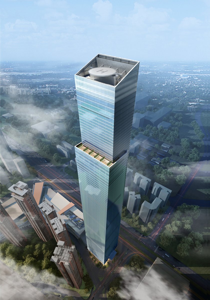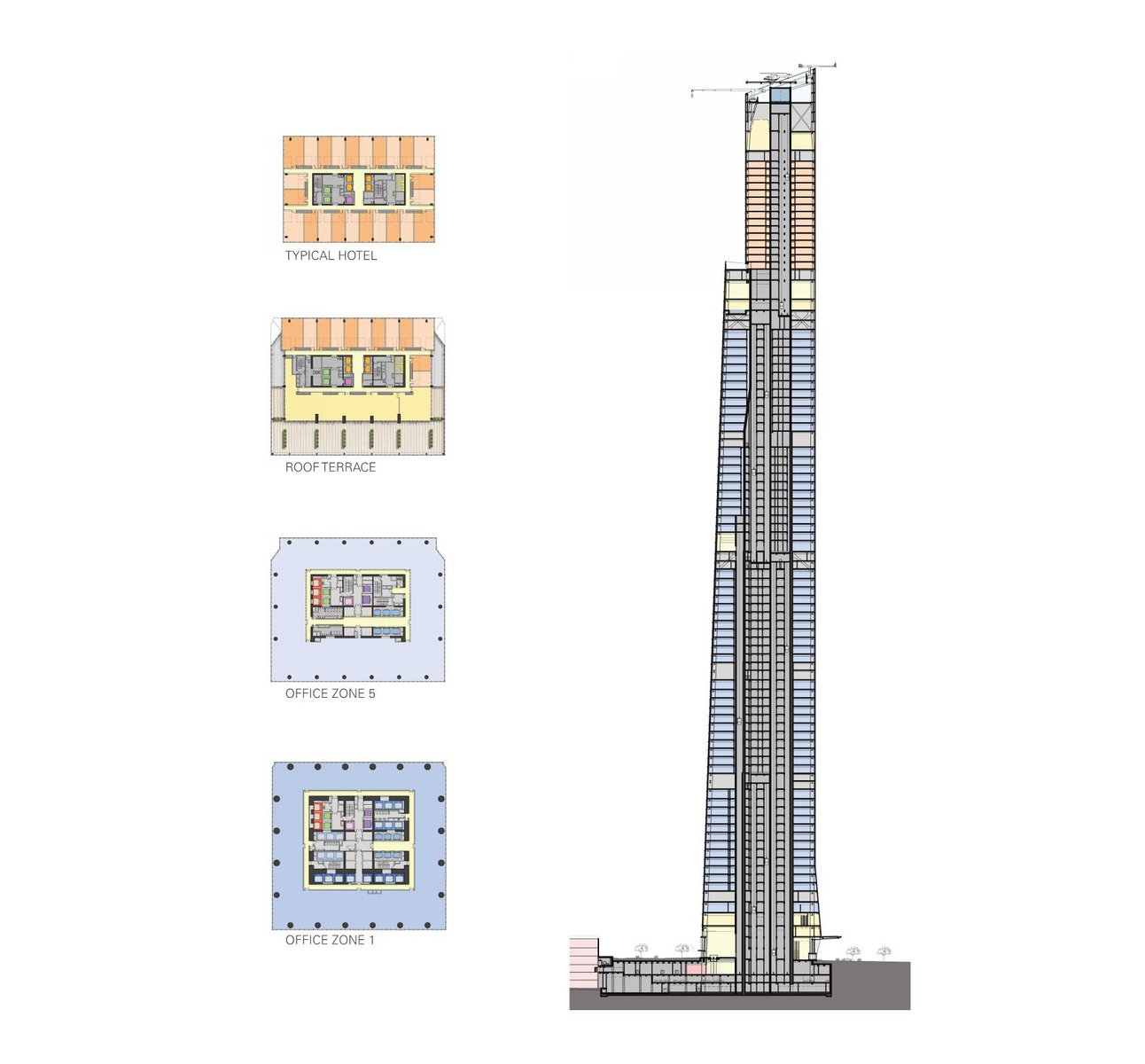 The design of the tower is derived from its multiple uses, which include more than 170,000 square meters of Class A office space, nearly 6,000 square meters of retail, and a 336-key Shangri-La hotel. The massing of the building steps and tapers to accommodate the changing floor plates of the various program types, resulting in a form that is both efficient and identifiable.