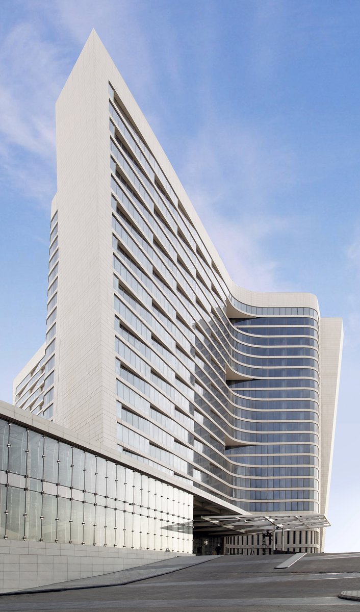 The hotel tower has multiple two-level atriums that rotate around the elevator core, creating internal light wells and providing movement in the overall massing. At the end of the guestroom corridors, windows offer daylight and additional views of the surrounding site, which aid in orientation. The hotel facade is expressed with undulating reveals along the glass faces, with solid, tapered end walls to frame the mass.