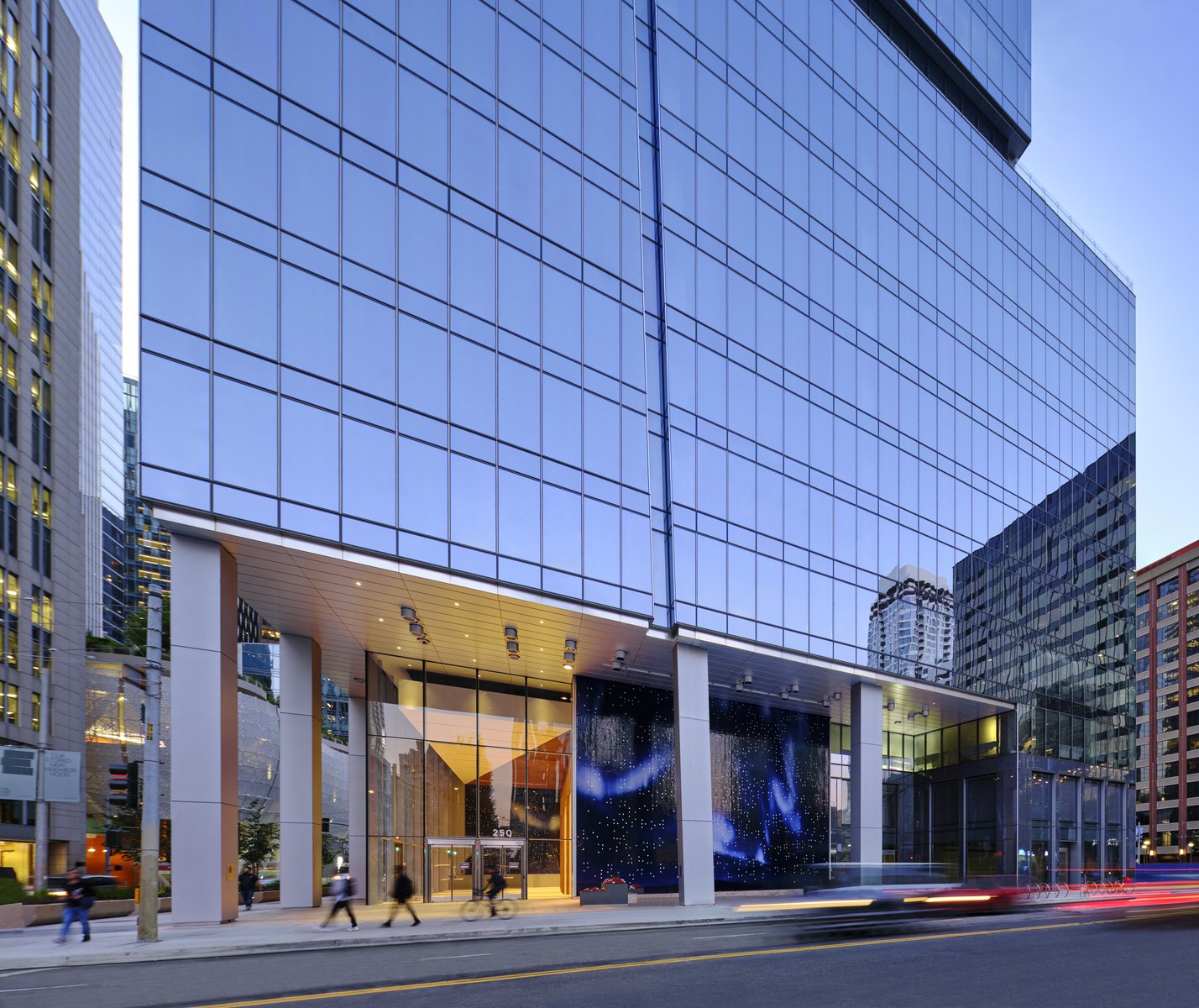 At the base of the tower is a covered 3,600-square-foot outdoor plaza with a 35-foot-high ceiling. The area is designated as privately owned public outdoor space (POPOS) that abuts both the tower’s main lobby and adjoining retail space. Along with a series of outdoor seating areas, a major focal point of this outdoor space is a large, site-specific art installation, entitled “Night Writing” by Teresita Fernandez, which is integrated into the main wall of the tower’s core.
