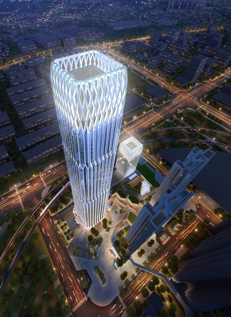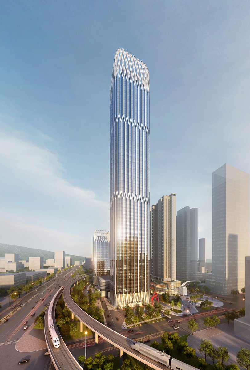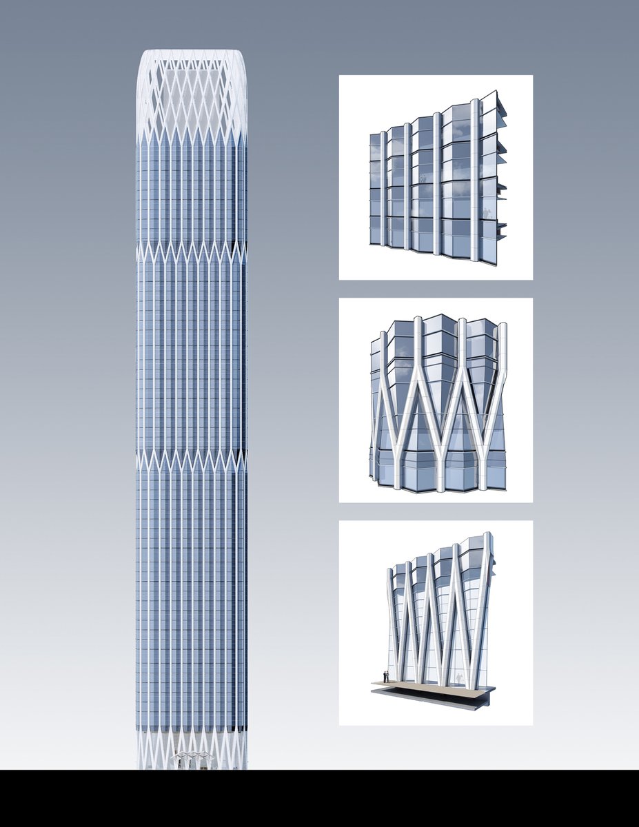 The master plan for the site focuses around a central plaza that provides internal vistas for the multi-building complex and is intended to create a dynamic civic atmosphere for the varied tenants and residents. The phased development is anchored by a soaring, 335-meter-tall landmark office tower poised to become an architectural icon for the region. The 60-story, 142,000-square-meter Class A office building utilizes a series of external trusses strategically located throughout the tower to provide stiffness while integrating the vertical columns to the perimeter profile, creating flexible, column-free interior space. The structural solution for the tower is integral to the exterior expression, with an elegant yet bold expression that culminates in a structural lattice at the crown to provide a unique skyline profile both day and night.