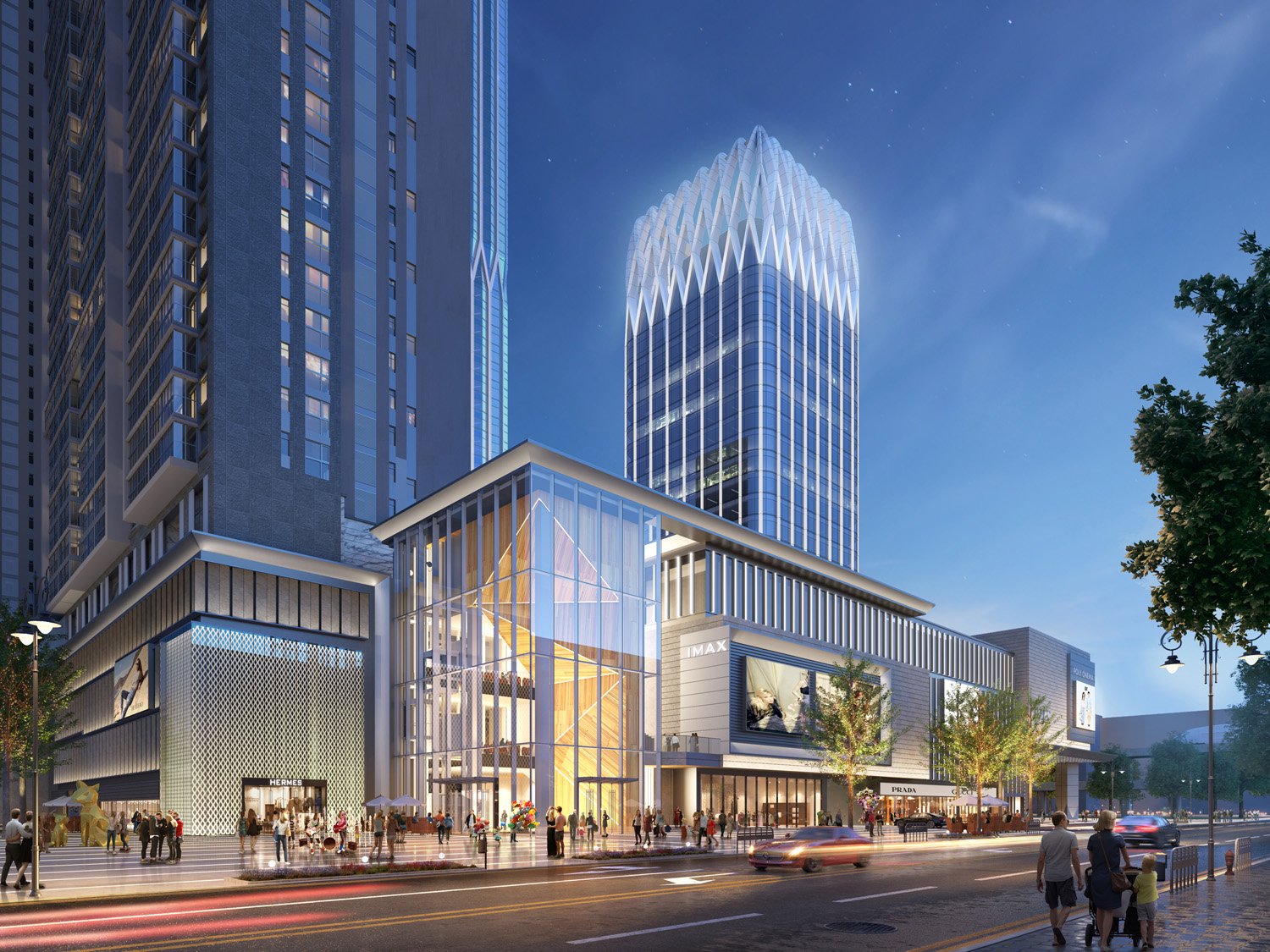 The landscaped central plaza is the heart of the development. Entry is oriented toward the major vehicular and pedestrian approaches from the southwest, and the meandering path winds its way into the site, transitioning visitors through three distinct stages from an active public square to a more serene retail atmosphere. The three primary elements include a plaza with newly commissioned sculptures, a signature display area presenting seasonal exhibits, and the retail court showcasing a central water feature. Surrounding the central courtyard, the three-level retail mall is planned with new restaurants and lounges, landscaped outdoor terraces, a cinema with an IMAX theater, and an expansive green rooftop that will be open to the public.