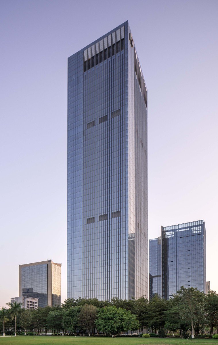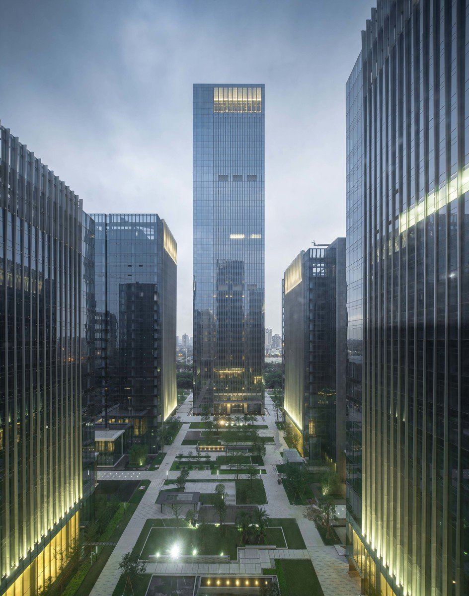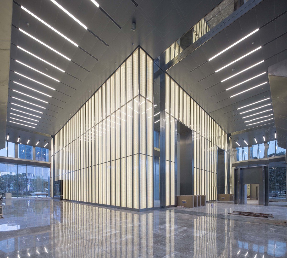 On top of the structure, a multistory winter garden offers unobstructed panoramic views of the surroundings. Lit at night, this signature space becomes a glowing beacon that provides identity for the Shunde business district.