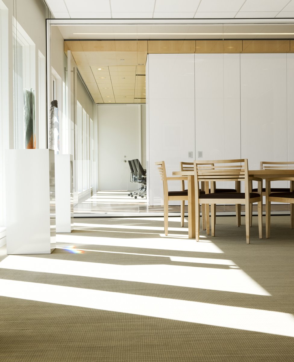 Inserted into a single-story, speculative office suite, the 7,500-square-foot facility is organized around three compositional elements: the colonnade, created by the building’s exposed structural steel columns and central ridge beam; full-height glass screen walls; and a custom maple “pavilion.”