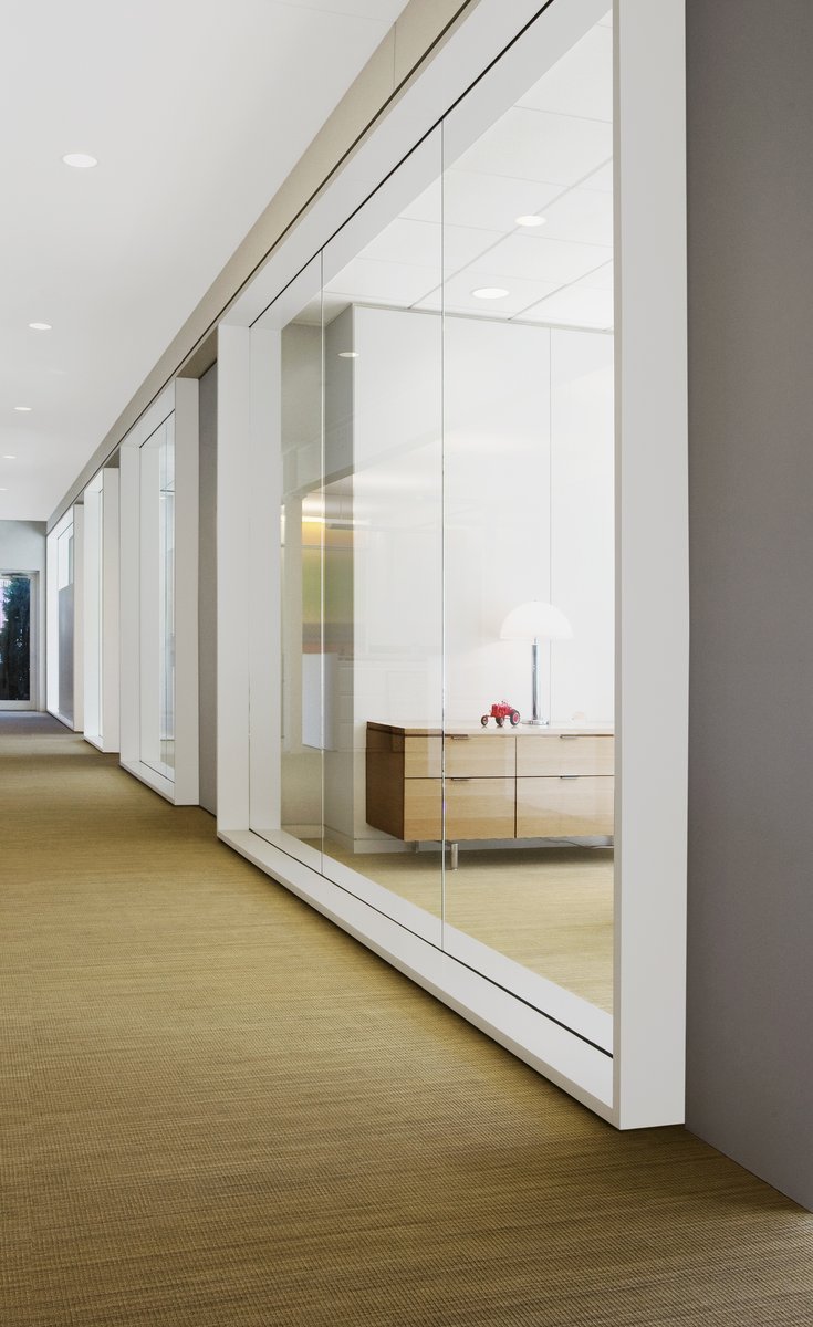 The simple, classic interior composition of thin glass frames and bold, clear millwork forms rendered in a timeless color palette—all awash in natural light—creates a platform in which the appreciation of fine art, design and nature enables a pioneering entrepreneur to continue his lifelong passion for creating business value through design.