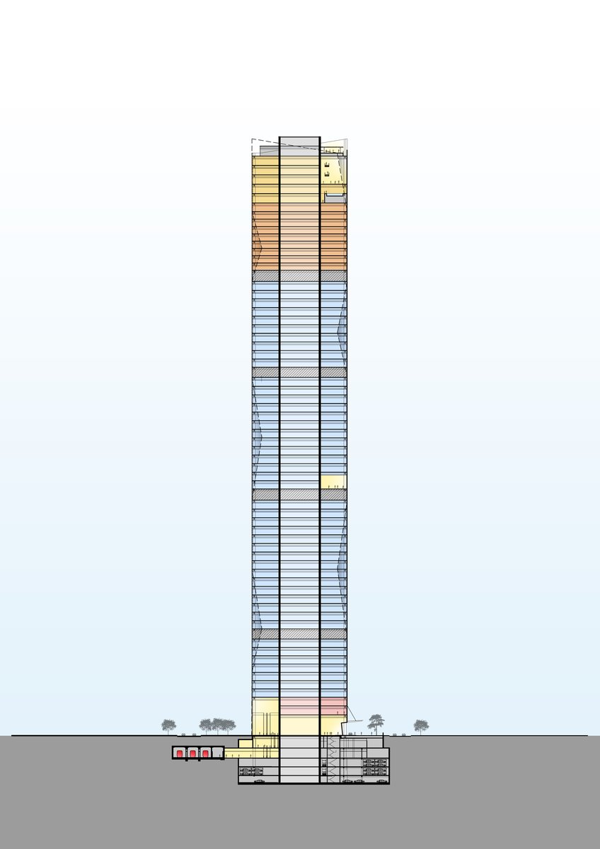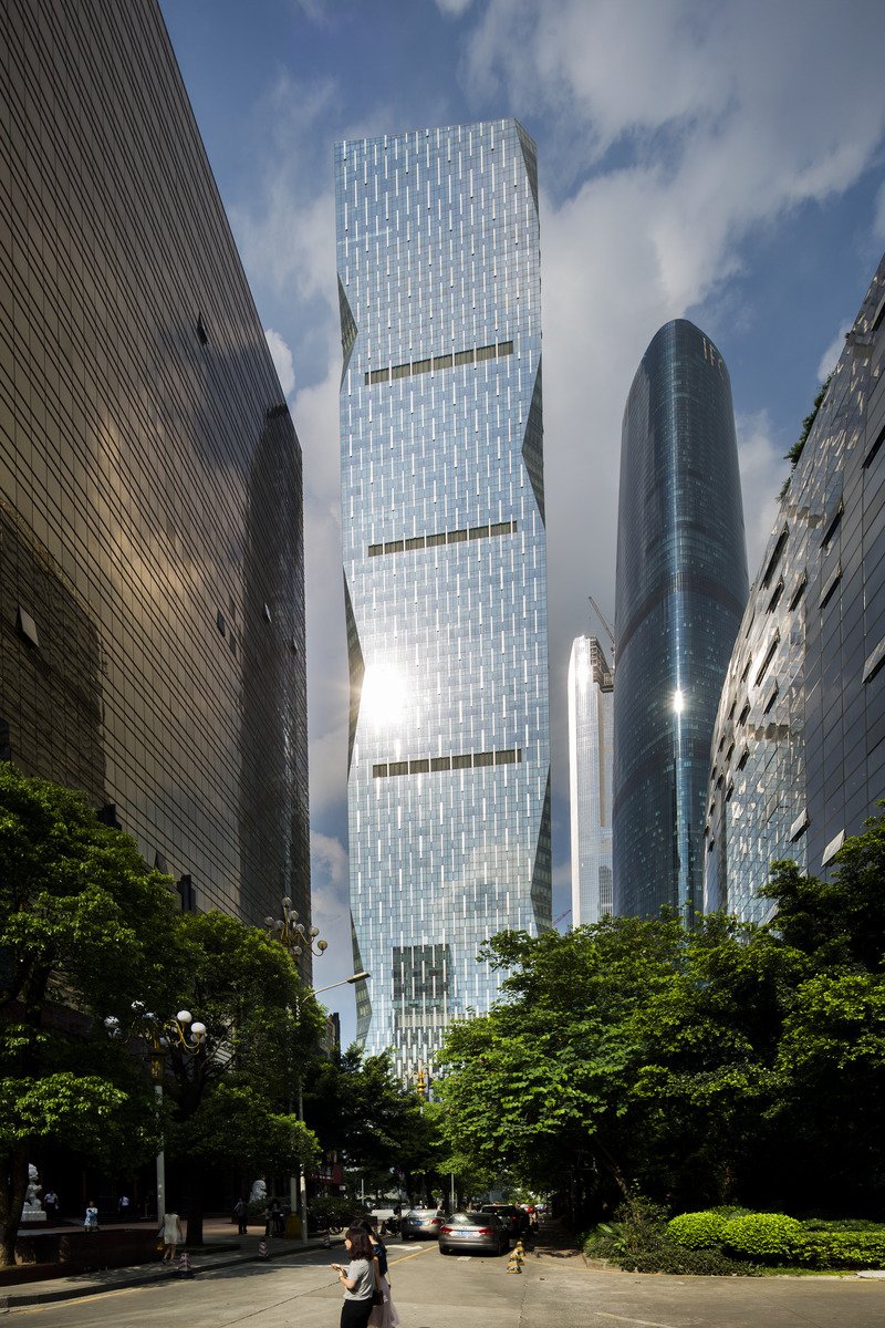 Located in Guangzhou’s new city center of Zujiang, R&F Yingkai Square emerges as part of a larger master plan of mixed-use towers that collectively signify the stature of Guangzhou as a major metropolitan city. The simple yet iconic form of the tower traces inspiration from the abundant local bamboo plants, rising 296 meters and defined by the building’s asymmetrically carved corners as well as the veining of vertical strips on the façade that provide a sense of visual movement. The strips compress and stretch as they rise, starting more dense at the base to enhance the sense of gravity. The Park Hyatt Guangzhou hotel occupies the building's uppermost floors, with office space below and subway connections below grade.