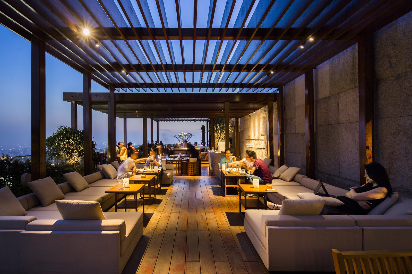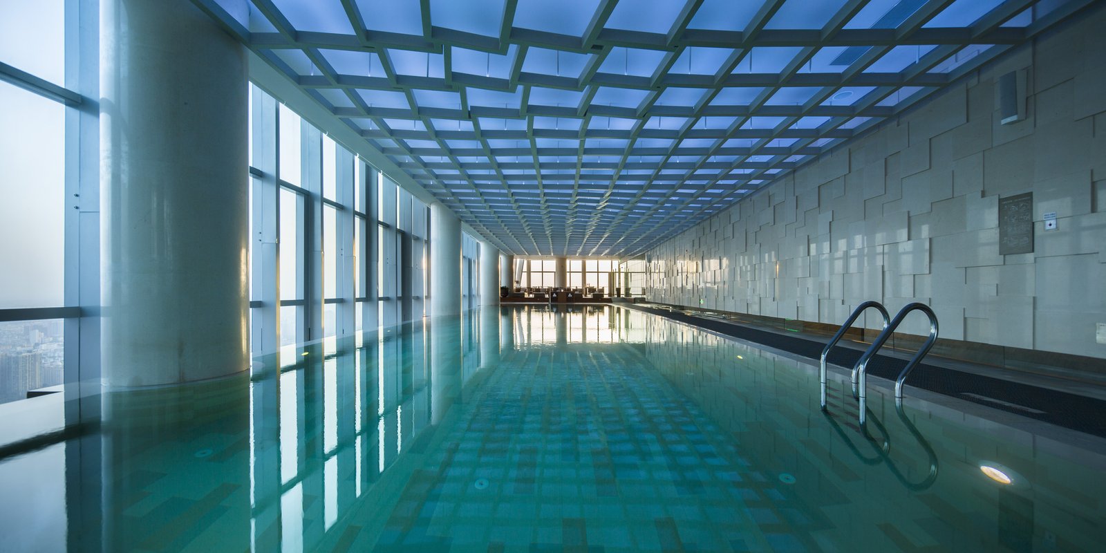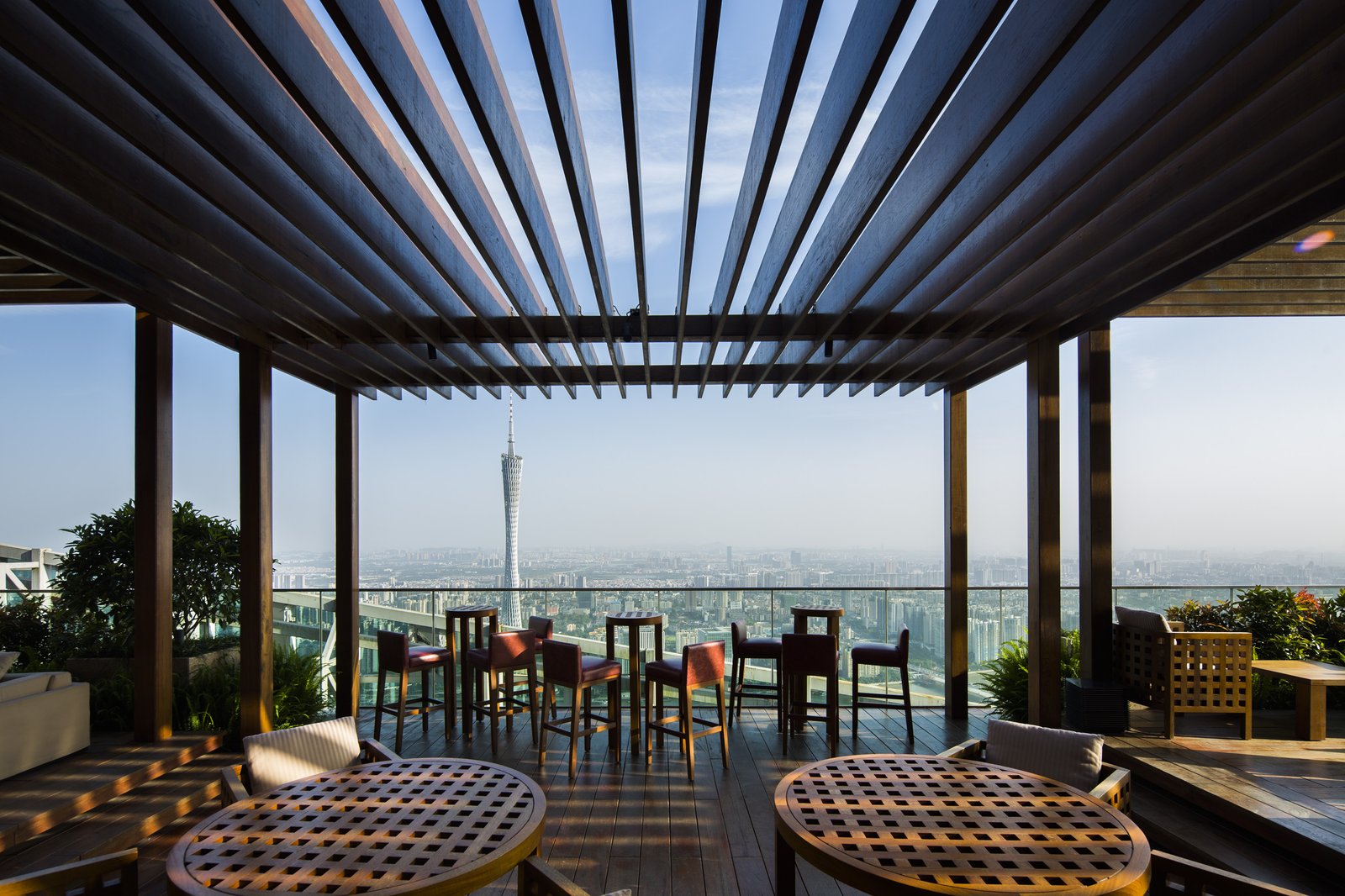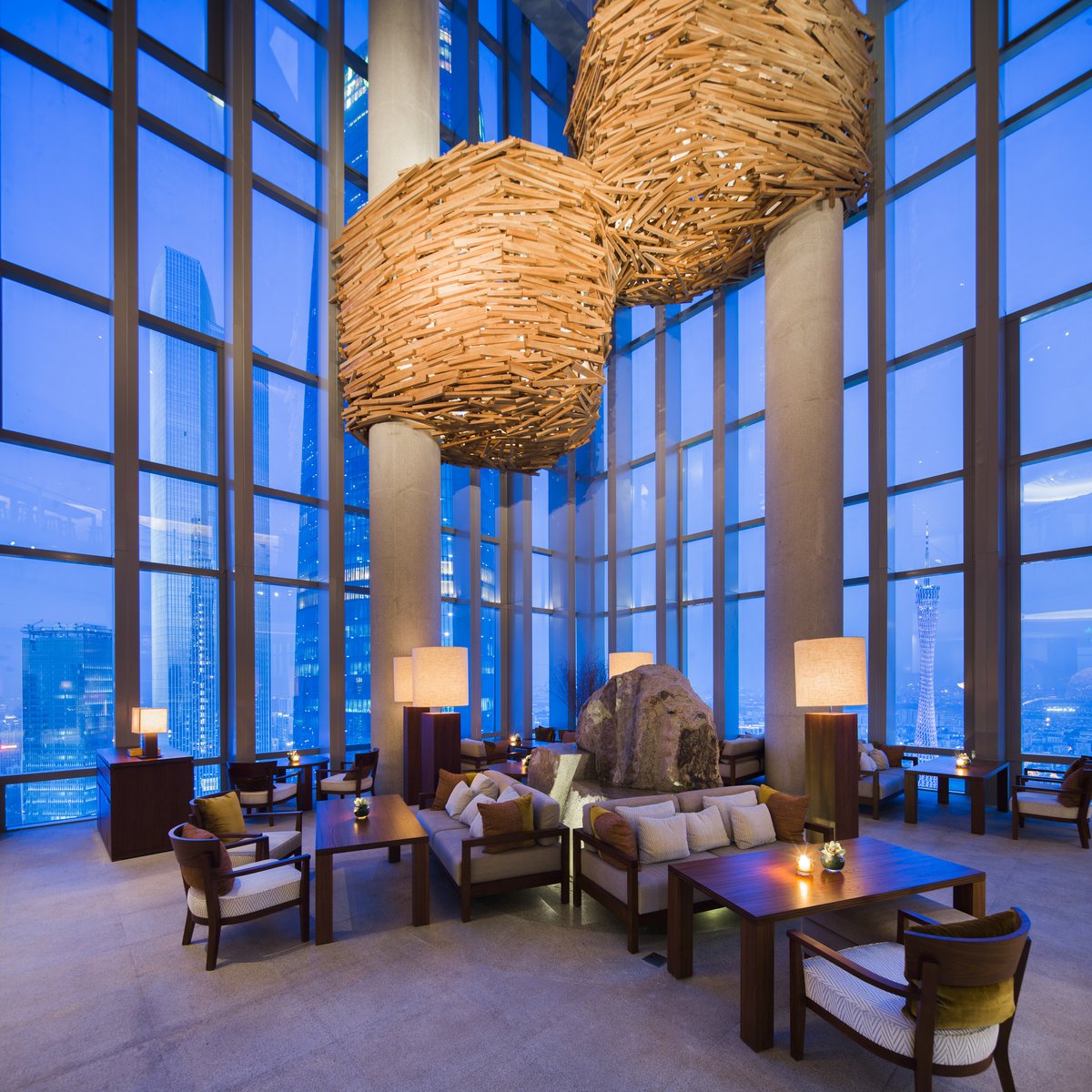 The building is at once connected to the urban street life around it while balanced with an intimacy required for a luxury hotel experience. The hotel drop-off and arrival sequence is choreographed to emphasize a sense of calm, with a warm, neutral palette punctuated by sculptures that aid in orientation. An infinity-edge pool on level 60 runs the length of one side of the building, overlooking the panoramic views of the Guangzhou skyline. A signature outdoor roof garden on level 70 offers similar sweeping views while providing an inviting space to dine and relax.