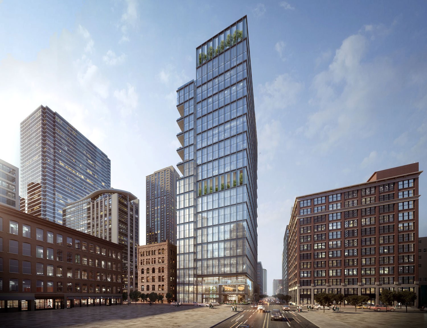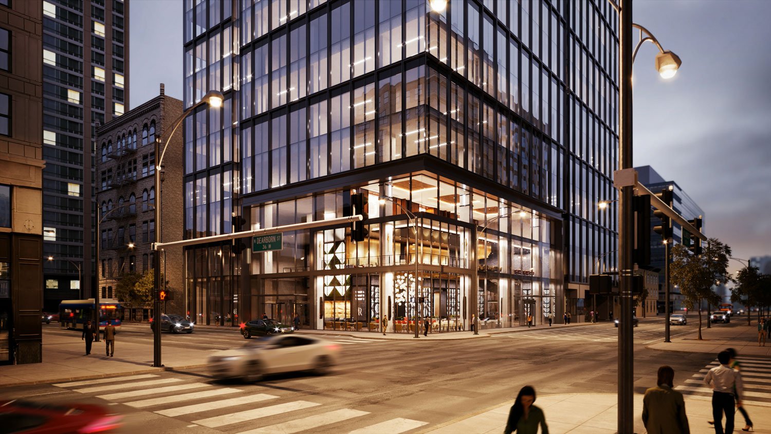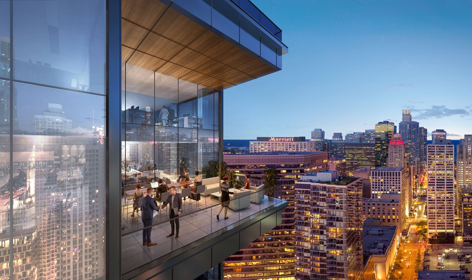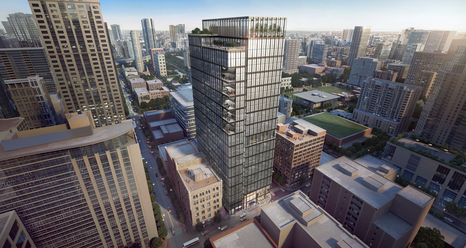 Totaling 674,000 square feet overall, the building program includes 570,000 square feet of Class A office space; 44,000 square feet of retail, conference and meeting rooms, and other amenities; a 40,000-square-foot connected firehouse; and 60 below-grade parking spaces. The retail component, in particular, involves a collaboration with Lettuce Entertain You Enterprises (LEYE). The Chicago firehouse architect is DLR Group.