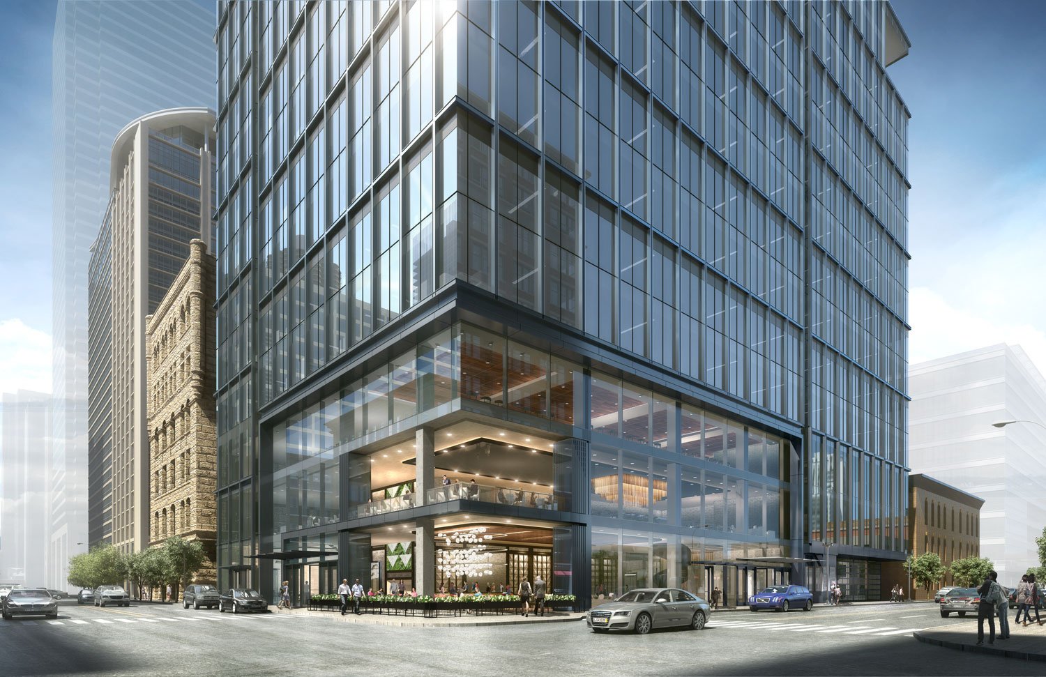 The 30-story building is designed to set itself apart from other downtown office towers. A material palette featuring black steel sets the overall tone, and a series of large outdoor terraces at the southeast and northwest corners further distinguish the building. On the interior, a large building lobby showcases an open concept, with a reception desk and lounge areas integrated with a signature restaurant and bar. Building amenities include private tenant terraces and a rooftop lounge.