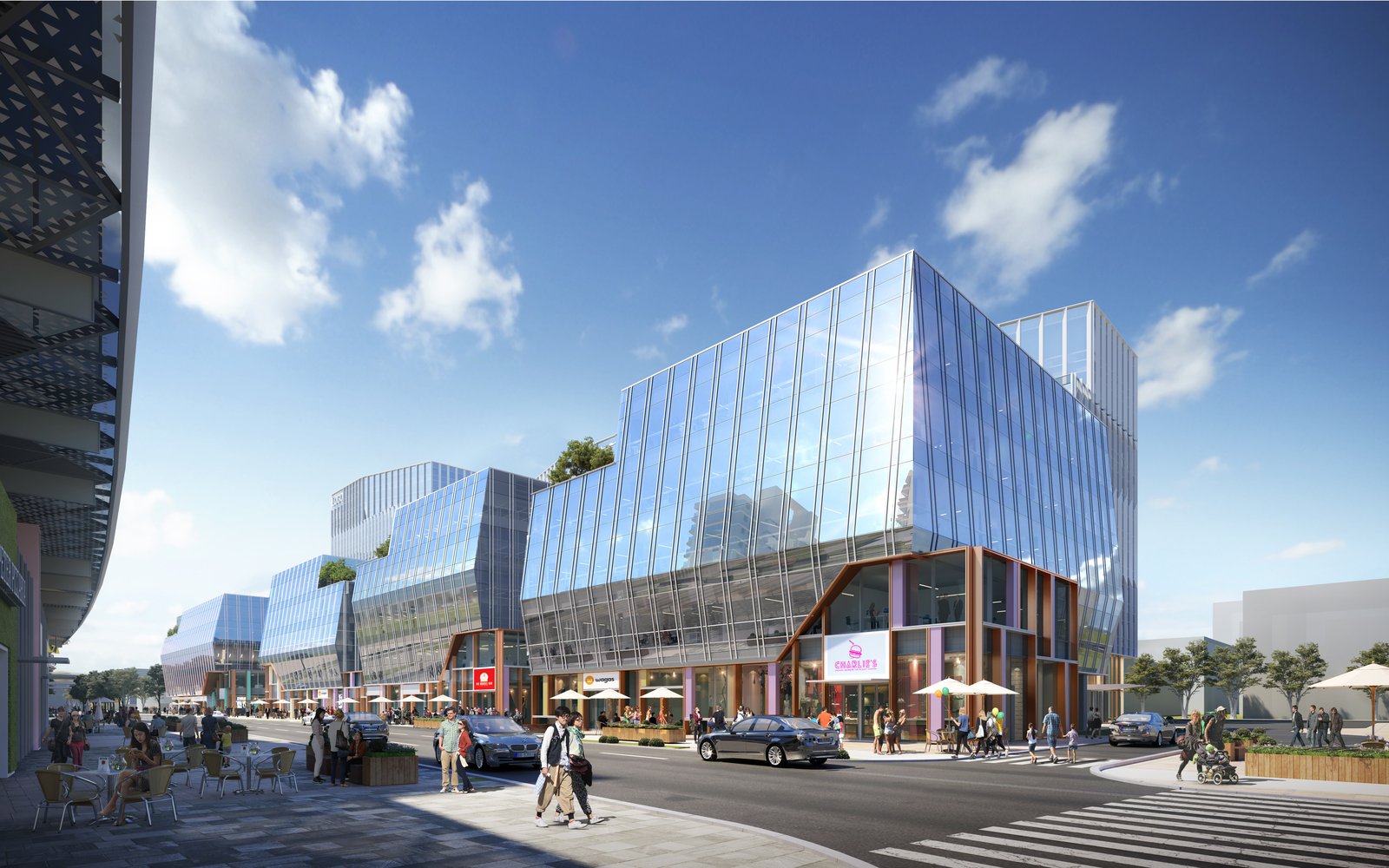 This assemblage of buildings and unique outdoor spaces are designed to create a cohesive image for the new campus while celebrating a sense of individuality and vibrancy at the pedestrian scale.