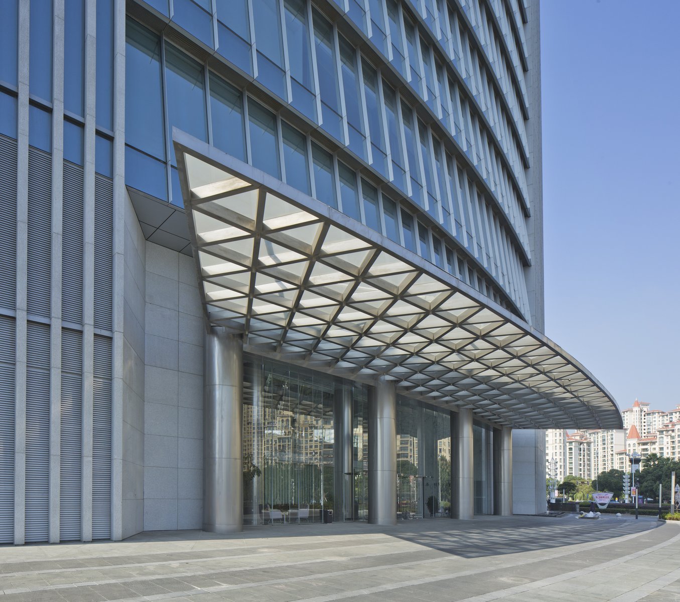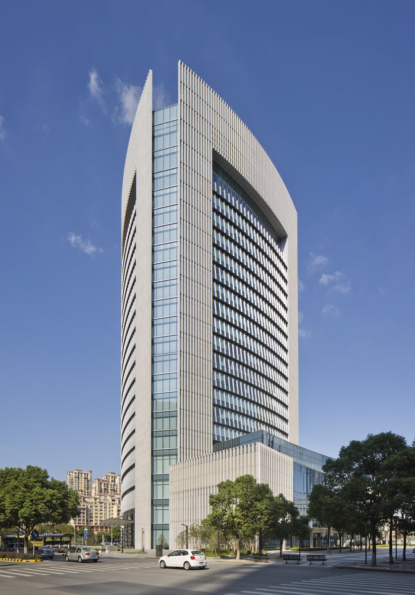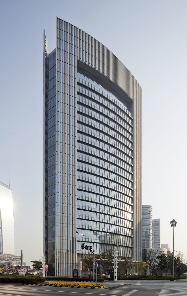 Within Suzhou, China, the office and stock exchange building is sited along the western edge of Jinji Lake in Suzhou Industrial Park, a major commercial and mixed-use district outside the city center. Prominently anchoring a major boulevard that leads to central Suzhou, the building is conceived as a modern gateway to the historic city center. The triangular massing design responds contextually to the view corridors of the city and lake, the solar orientation of the site, and the major diagonal vehicular artery. The triangular form is also seen symbolically in China as a balanced and stable form, an image well suited to a stock exchange headquarters.