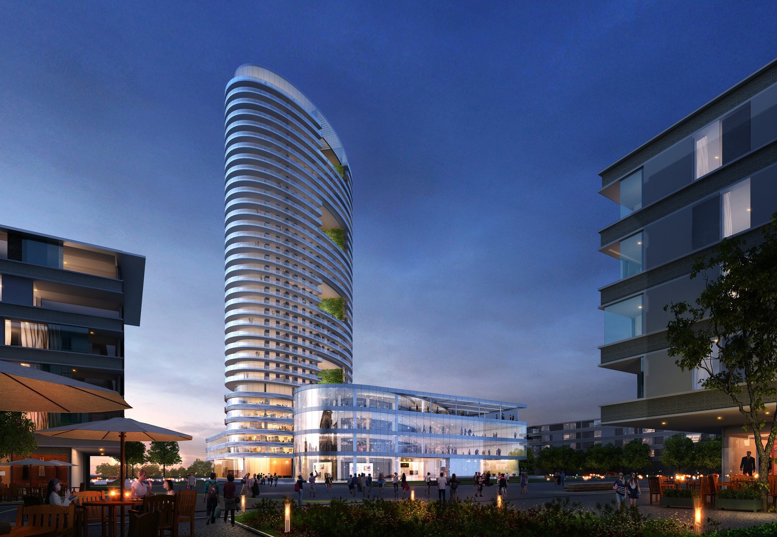 The tower and its annex building are positioned in direct relationship to the main square and intended as the focal point of the development. A park located to the north will create a buffer between the low-rise residential buildings, and the public plaza and square and will become an important amenity to the overall development.