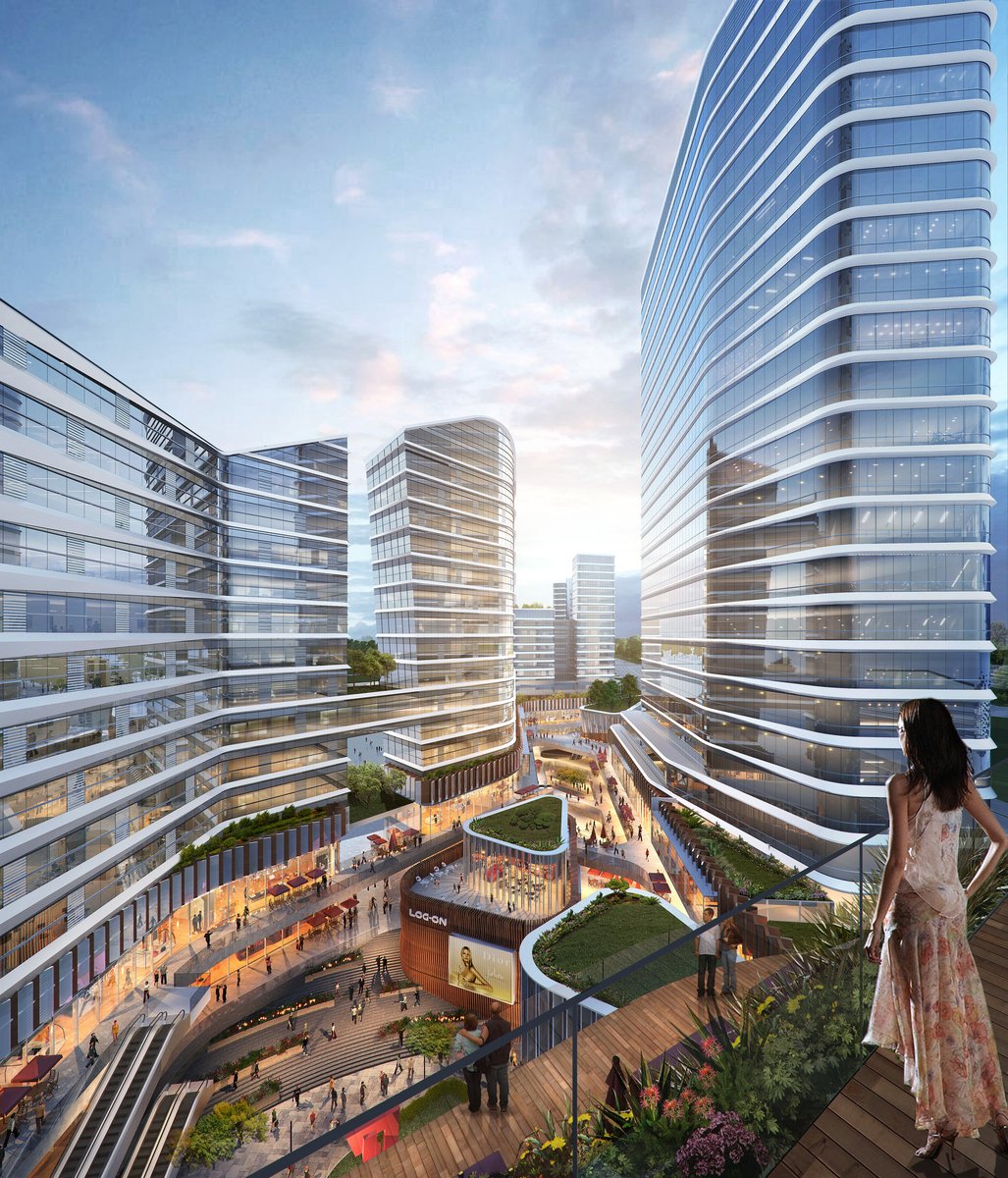 One of the defining characteristics of the project is an environmentally friendly atmosphere that seamlessly connects the development with nature. The office buildings are conceived to provide a park-like setting, with indoor-outdoor workspaces that appeal to technology, start-up and entrepreneurial organizations. An abundance of shared public space and lush, green retail streets combining leisure and entertainment activities promote a one-stop urban destination that offers visitors a unique experience. Fountains, pavilions and green walkways further establish the design as a natural extension of a positive lifestyle and vital contributor to enhancing health and well-being for the local residents of Shanghai.