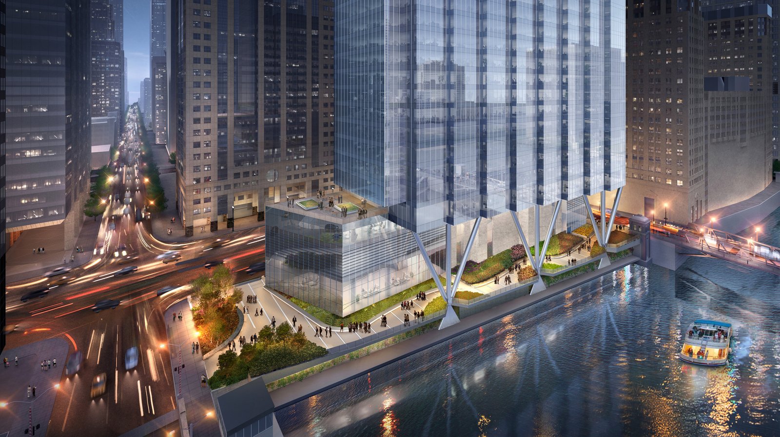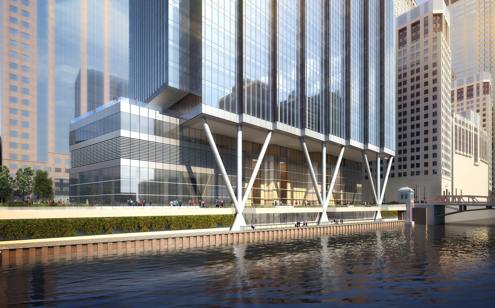“One of the few office building sites in downtown Chicago bounded by three streets and the Chicago River, 110 North Wacker Drive is the last premier office site in Chicago offering unmatched views of and from the building.” said James Goettsch, FAIA, Chairman and CEO of Goettsch Partners. “The site’s trapezoidal shape allows us to provide a series of stepped projections on the western façade, enhancing views up and down the river, emphasizing the building’s verticality and providing the building with a distinct identity. At street level, almost half of the site is publicly accessible and features a soaring covered riverwalk, supported by a distinctive structural design.”